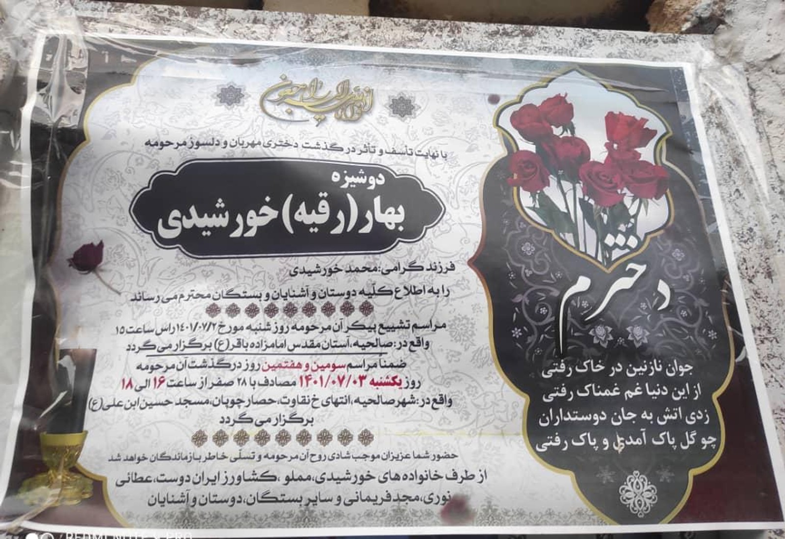 ایران‌اینترنشنال به اسناد و مدارکی دست پیدا کرده که بر اساس آن دختری ۲۳ ساله به نام بهار (رقیه) خورشیدی، معلم و مترجم زبان و هنرمند نقاش ساکن شهرستان رباط‌کریم، اوایل مهر ماه در جریان خیزش انقلابی علیه جمهوری اسلامی کشته شده است.