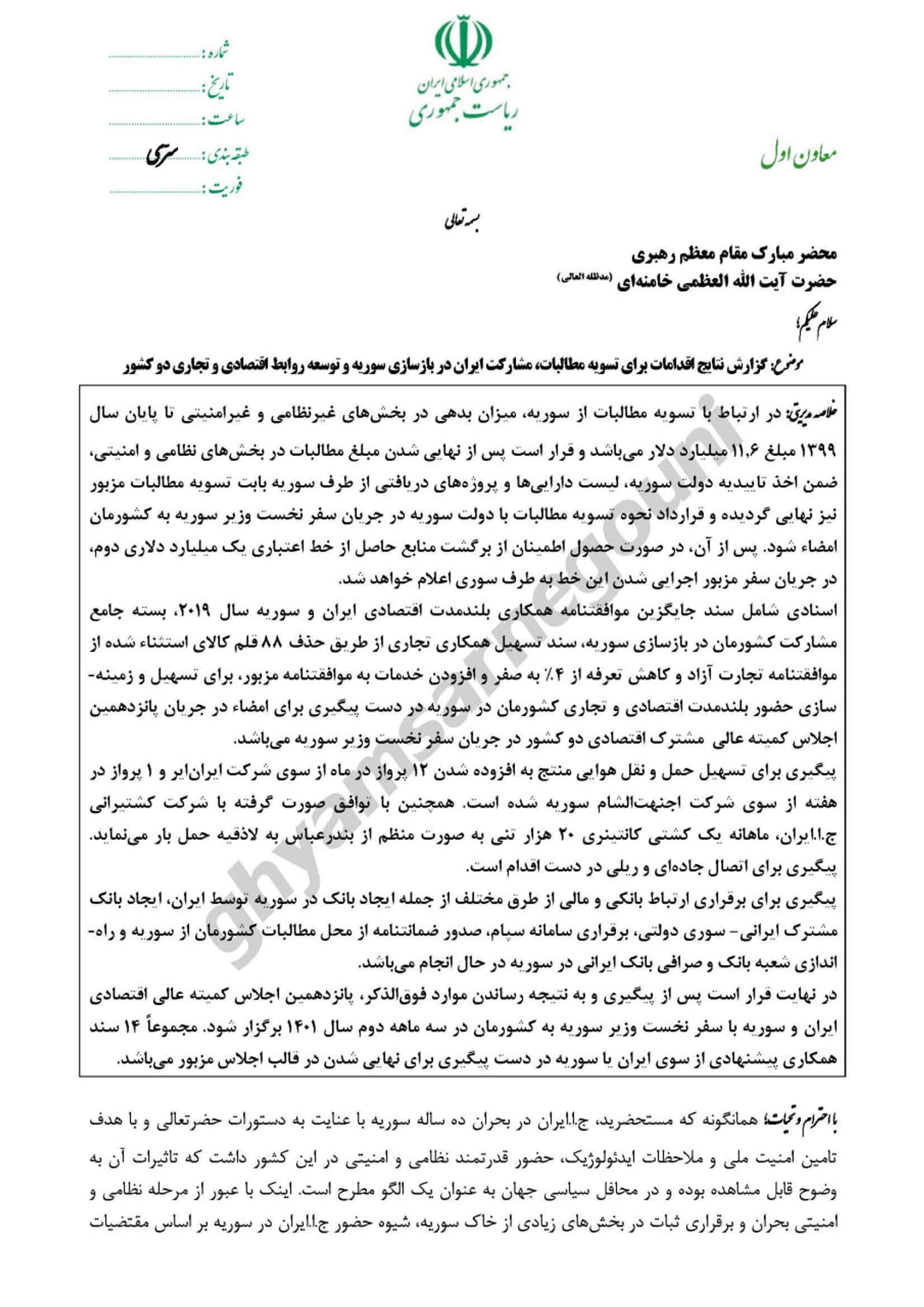 بر اساس یکی از اسناد منتشر شده توسط این گروه، محمد مخبر، معاون اول ابراهیم رئیسی در نامه به علی خامنهای بدهیهای سوریه به ایران در بخشهای غیر نظامی و غیر امنیتی را حدود ۱۱.۶میلیارد دلار تا سال ۱۳۹۹ اعلام کرده است.