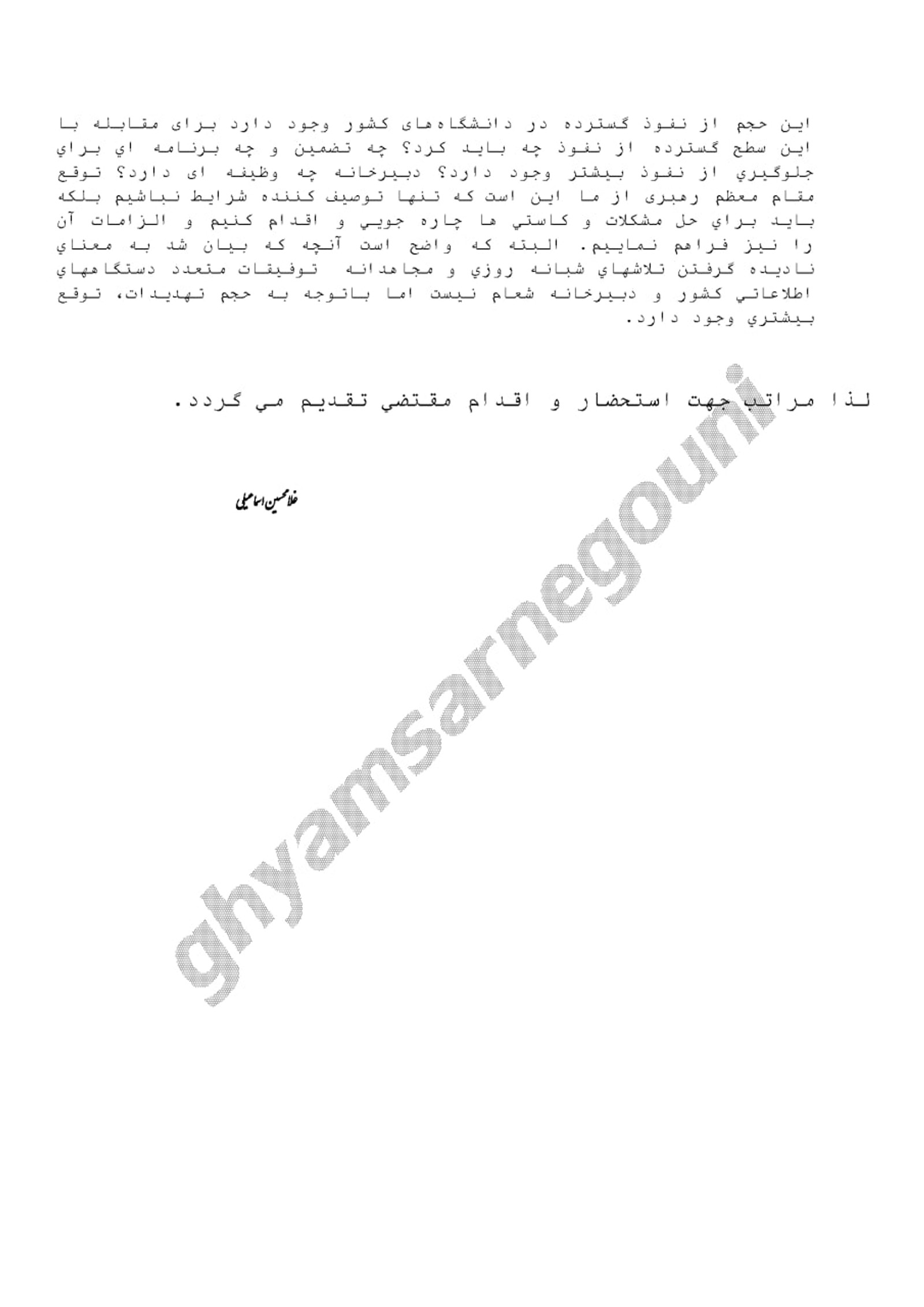 در این نامه نوشته شده که نهادهای امنیتی از برخی از اعترات در مهر و آبان غافلگیر شده و «پیشبینی و پیشگیری لازم» را انجام ندادهاند.