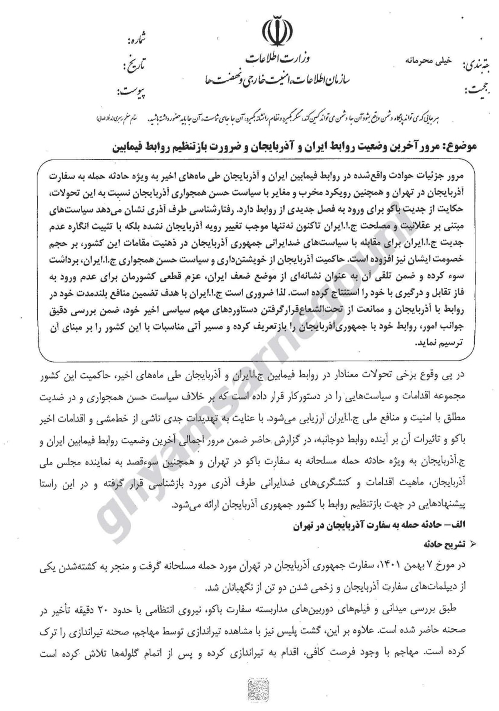 در یکی از اسناد منتشر شده توسط گروه «قیام تا سرنگونی» نیز نامه وزارت اطلاعات درباره روابط جمهوری اسلامی و جمهوری آذربایجان منتشر شده است. در یکی از این نامهها اعلام شده که نیروی انتظامی پس از حمله اخیر با ۲۰ دقیقه تاخیر در محل سفارت جمهوری آذربایجان حضور یافته است.