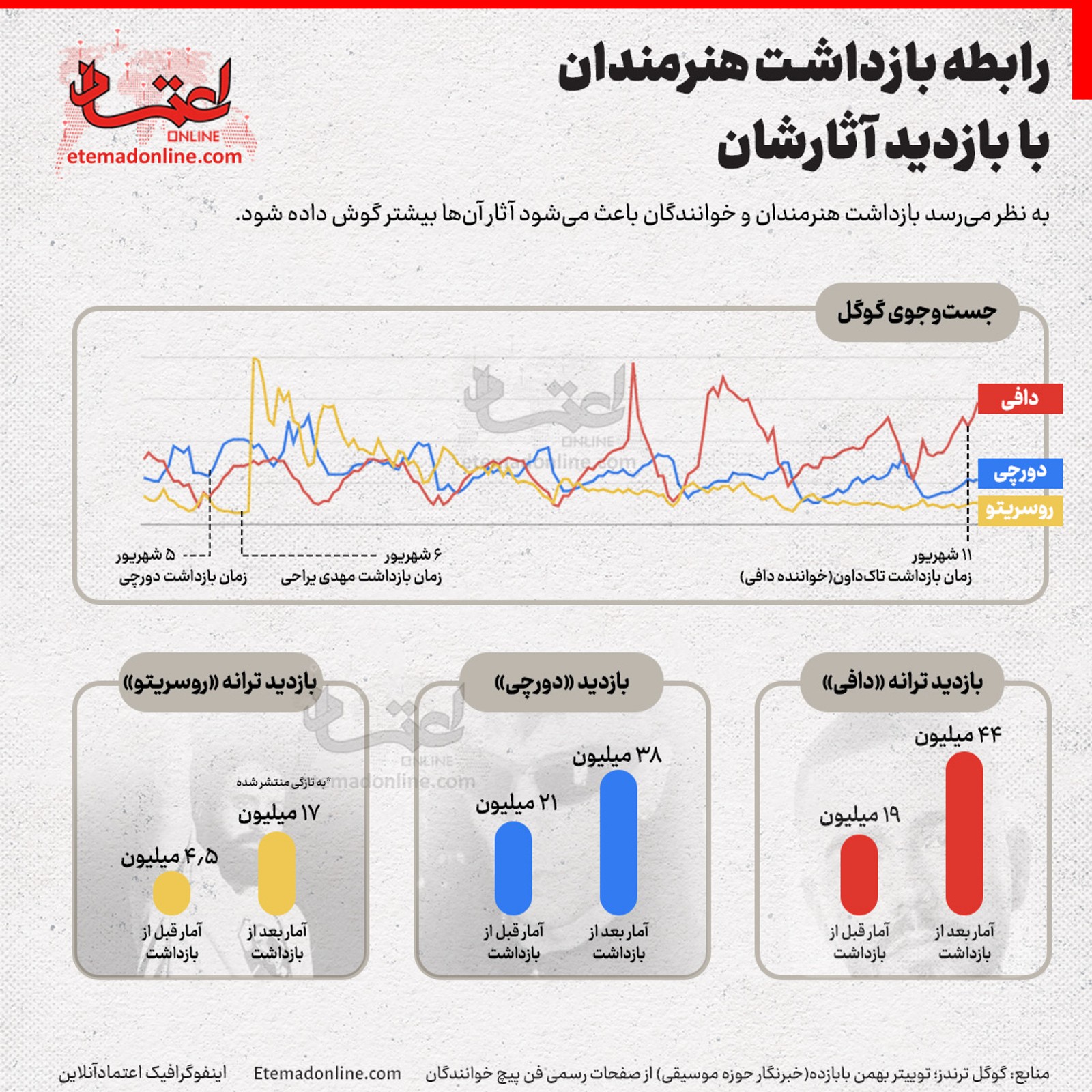 اعتماد در مطلبی همراه با یک اینفوگرافی که البته پس از مدتی از صفحه این رسانه حذف شد، نوشت: «به نظر می‌رسد بازداشت هنرمندان و خوانندگان باعث می‌شود آثار آن‌‌ها توسط مردم بیشتر گوش داده شود.»