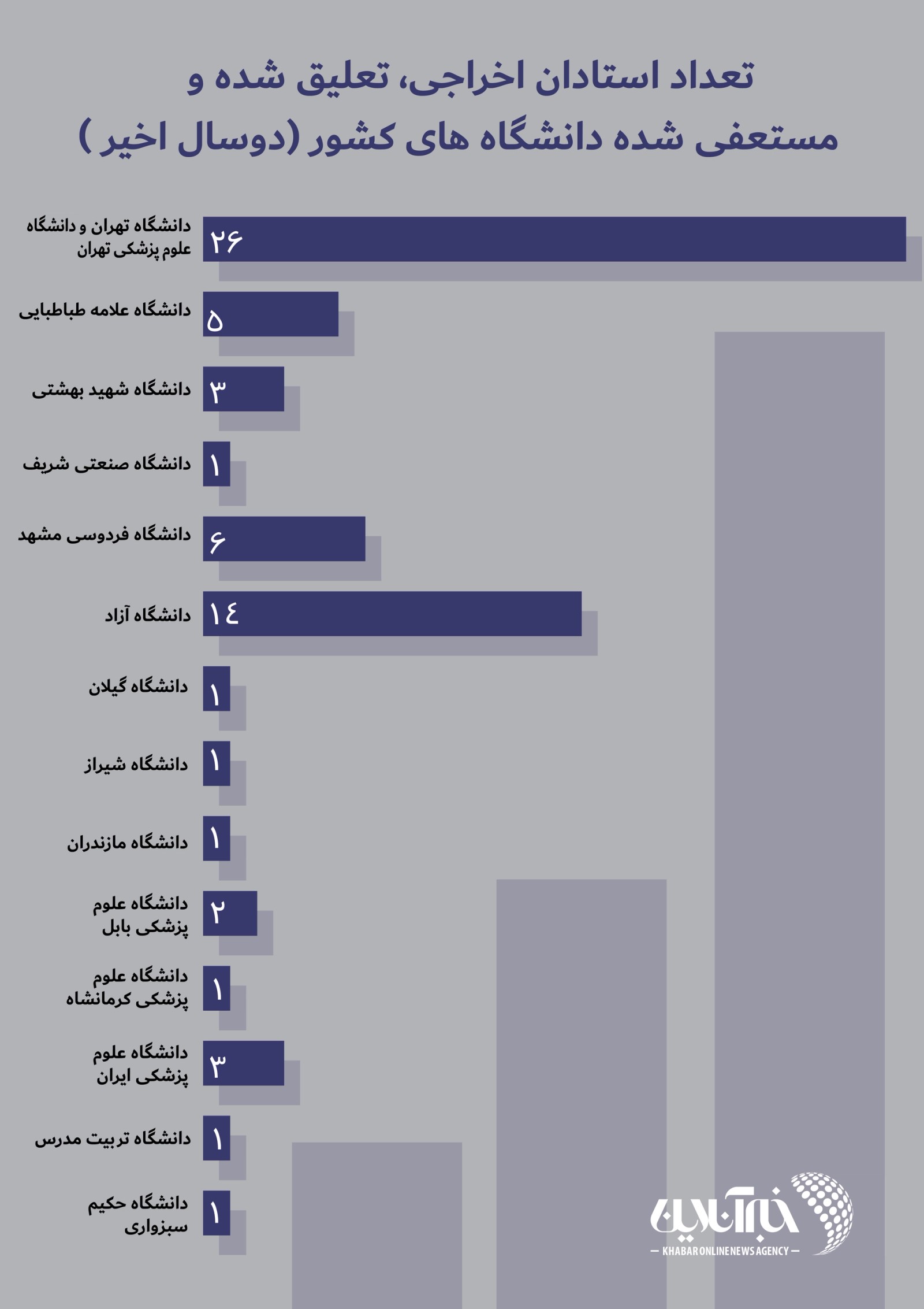 خبرآنلاین در ادامه گزارش خود آورده است در دو سال گذشته حدود ۶۰ استاد از دانشگاههای سراسر کشور اخراج، تعلیق یا مجبور به استعفا شدهاند که بیشترین آمار به دانشگاه تهران و دانشگاه علوم پزشکی تهران با ۲۶ استاد اخراجی یا تعلیقی تعلق دارد.