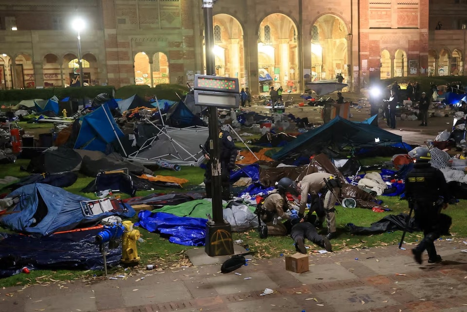به گزارش خبرگزاری رویترز، در ساعات قبل از سپیده دم پنجشنبه، پلیس به شهر چادری برپا شده در دانشگاه کالیفرنیا در لس آنجلس رفت و با استفاده از تجهیزات ضد شورش، صف معترضانی را که در تلاشی بیهوده برای جلوگیری از پیشروی پلیس، دستها را به هم زنجیر کرده بودند، در هم شکست.