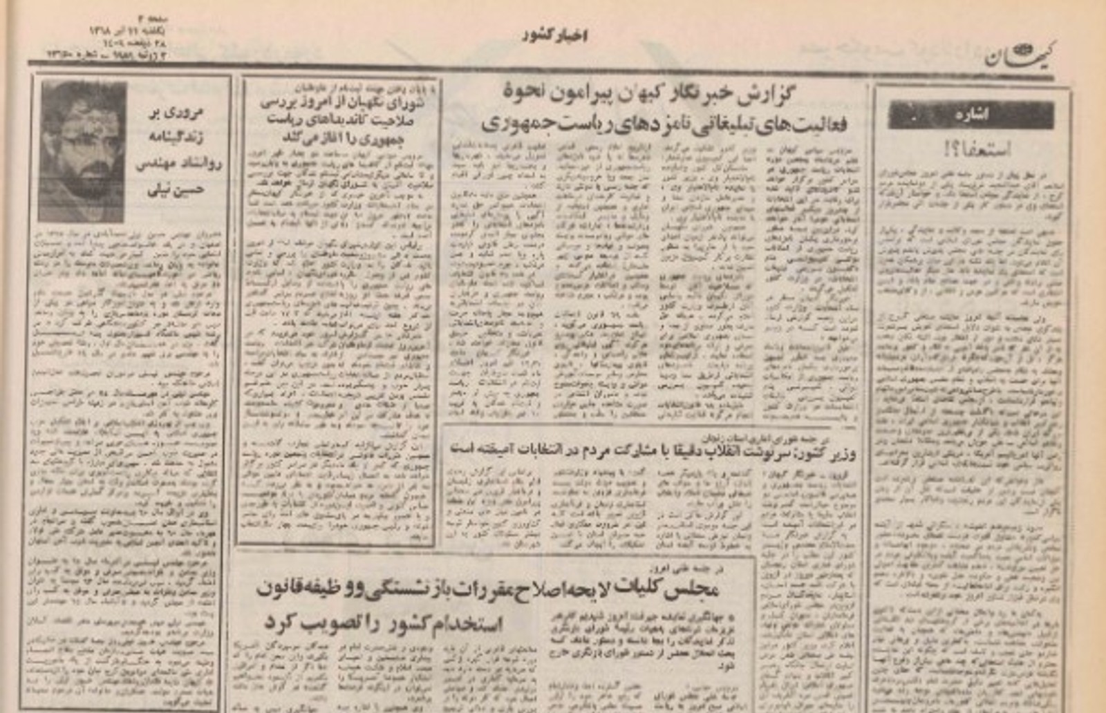 روزنامه کیهان در صفحه دو شماره مورخ ۱۱ تیر ۱۳۶۸ درباره مرگ حسین نیلی احمدآبادی نوشت که او روز جمعه ۹ تیر ۱۳۶۸، در حالی که در سمت عضو هیات مدیره سازمان صنایع دفاع انجام وظیفه میکرد، به هنگام بازگشت از ماموریت در اتوبان کرج جان خود را از دست داد.