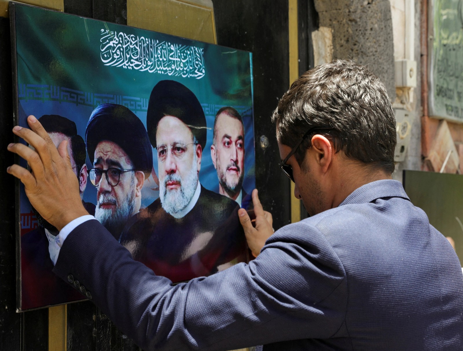 ادای احترام یکی از اعضای حوثیهای یمن به ابراهیم رئیسی و حسین امیرعبداللهیان پس از کشته شدن آنها در سانحه هوایی، سفارت جمهوری اسلامی در صنعا، یکم خرداد