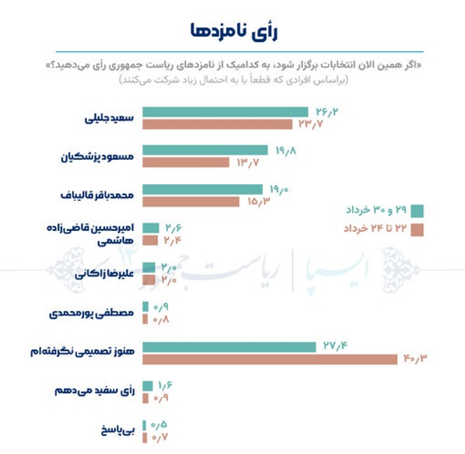از میان افرادی که مشارکتشان را در انتخابات قطعی اعلام کردند، ۲۶/۲ درصدشان گفتهاند به جلیلی، ۱۹/۸ درصد اعلام کردهاند به پزشکیان و ۱۹ درصد گفتهاند به قالیباف رای میدهند.