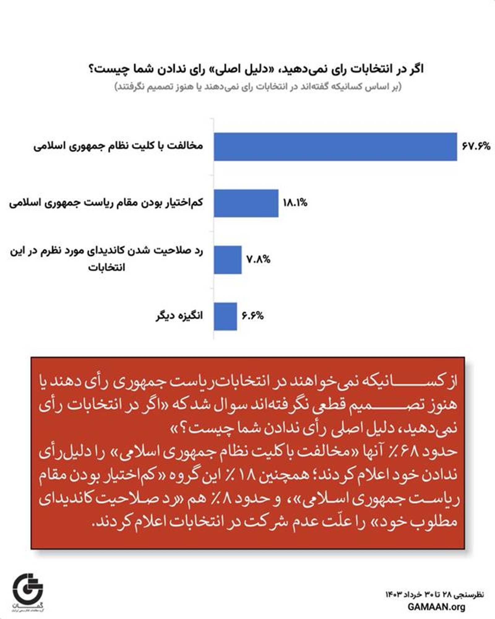 موسسه گمان از پاسخدهندگان نظرسنجی پرسیده که اگر در انتخابات رای نمیدهند، دلیل اصلیشان برای این تصمیم چیست؟
