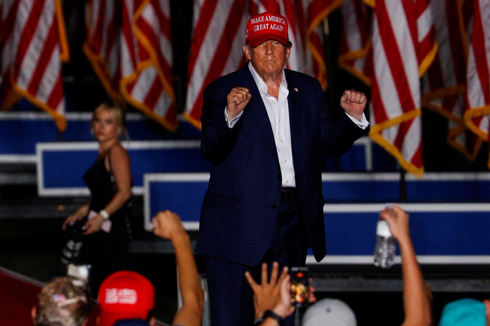 ترامپ قبل از قرار گرفتن در خودرو مشت خود را به هوا برد. مشخص نبود که او به کجا منتقل شده است.