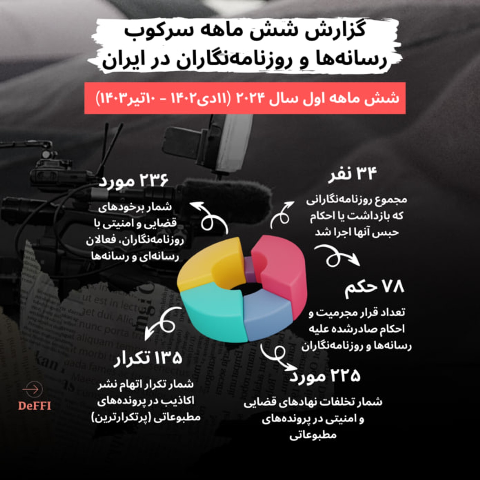 سازمان دفاع از جریان آزاد اطلاعات (DeFFI) گزارش داد که در شش ماهه اول سال جاری میلادی، ۱۸۱ روزنامه‌نگار و رسانه، برخورد قضایی و امنیتی را تجربه کردند. در این مدت دست‌کم ۳۴ روزنامه‌نگار و فعال رسانه‌ای بازداشت شدند یا برای اجرای احکام حبسشان به زندان رفتند.
