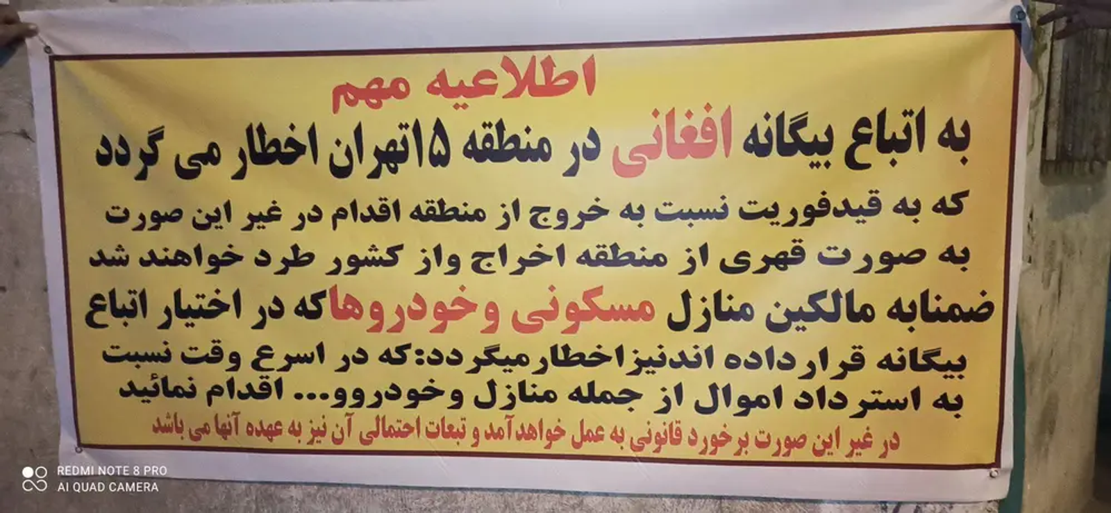 در این اطلاعیه که فرد یا نهاد منتشر کننده آن مشخص نیست، به مهاجران افغان اخطار داده شده است که اگر از منطقه ۱۵ نروند، «به صورت قهری از ایران اخراج خواهند شد».