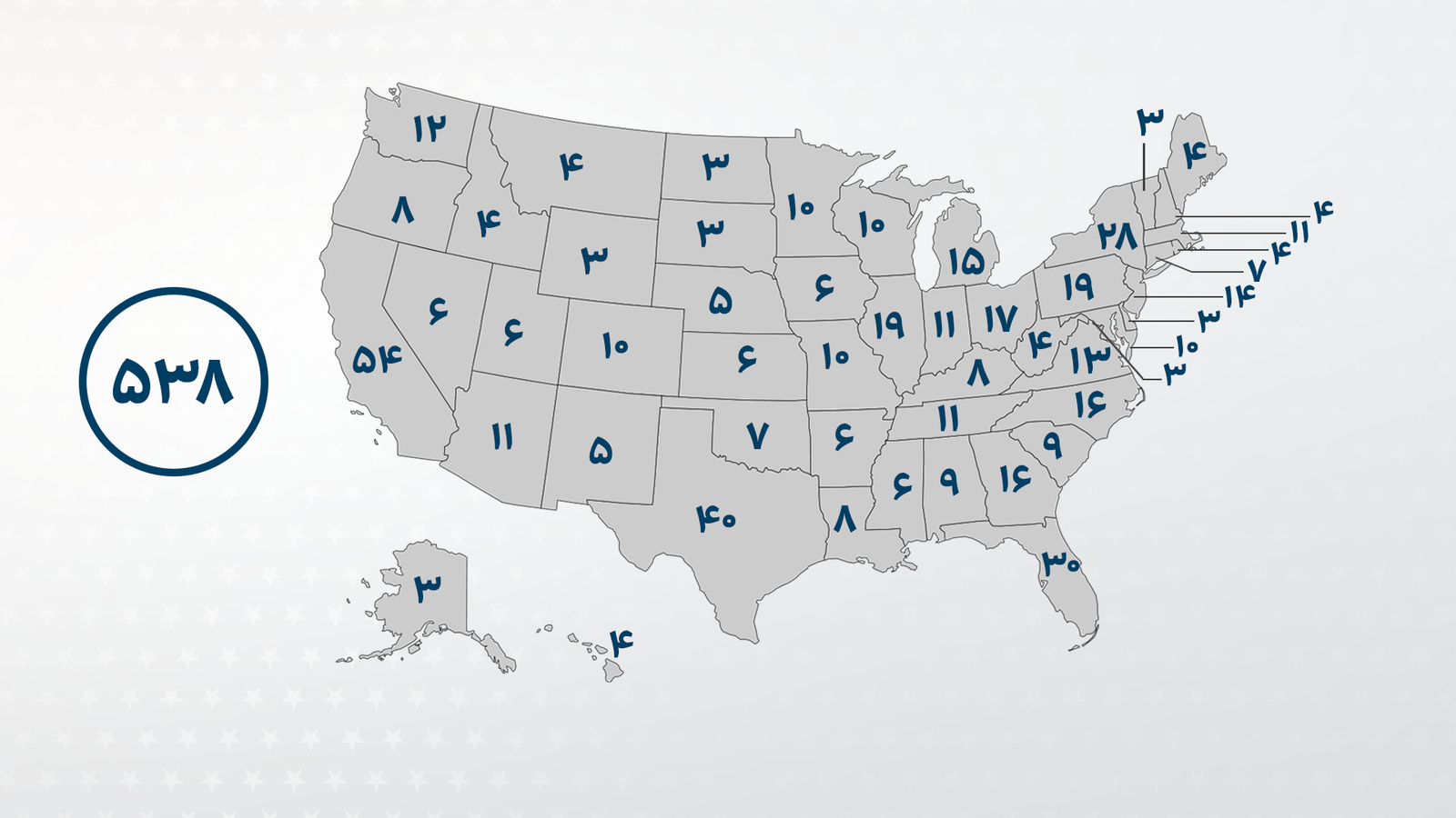 در مجموع ۵۳۸ رای الکترال وجود دارد. برنده نامزدی است که نصف + یک این آرا را به دست آورد و مرز پیروزی ۲۷۰ است.