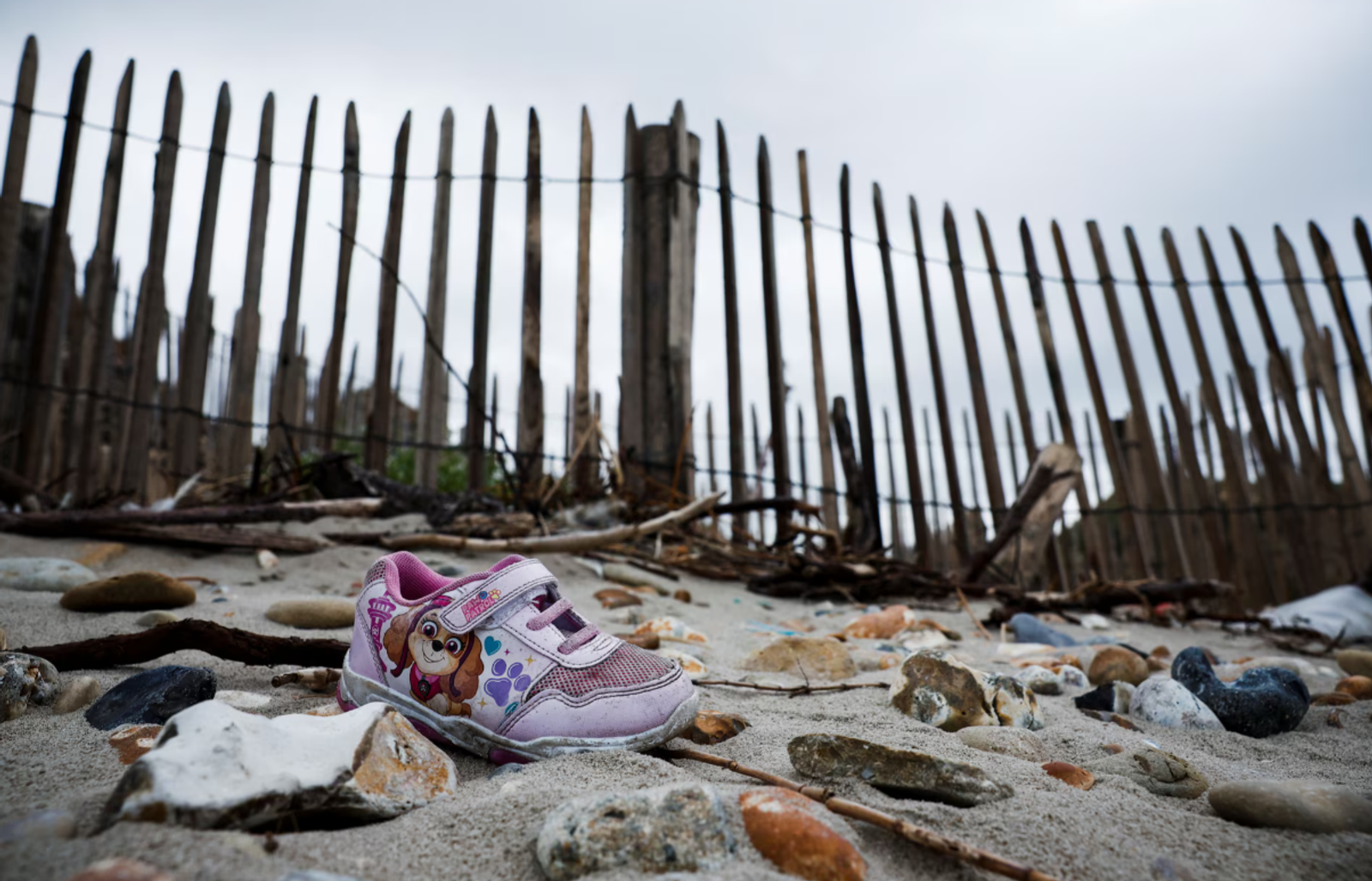 لنگه کفش باقی‌مانده از یک کودک مهاجر در سواحل منطقه ویمرو، فرانسه، ۱۴ شهریور