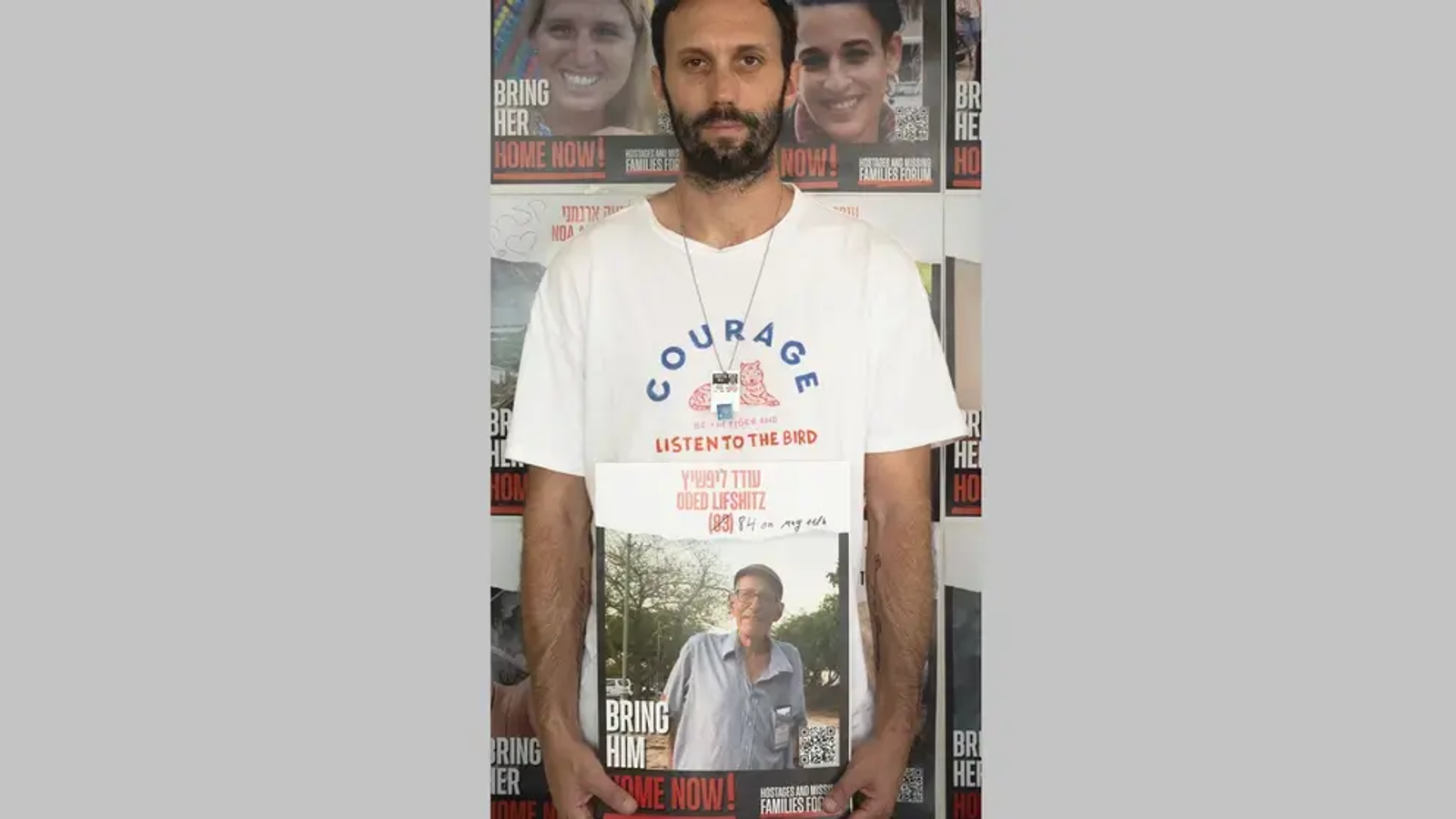 دانیل لیفشیتز عکسی از پدربزرگش اودد لیفشیتز که هنوز در غزه گروگان است در دست دارد.