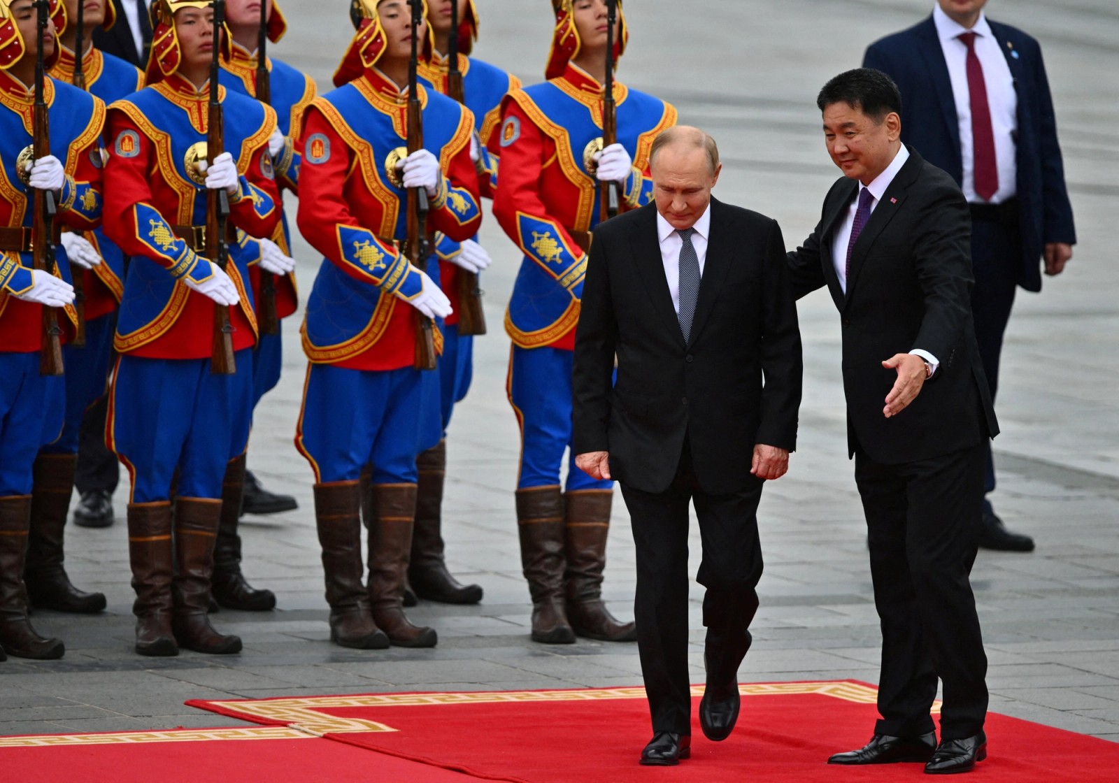 استقبال رسمی اوخناگین خورلسوخ، رییسجمهوری مغولستان، از ولادیمیر پوتین، همتای روس خود، اولانباتور، ۱۳ شهریور