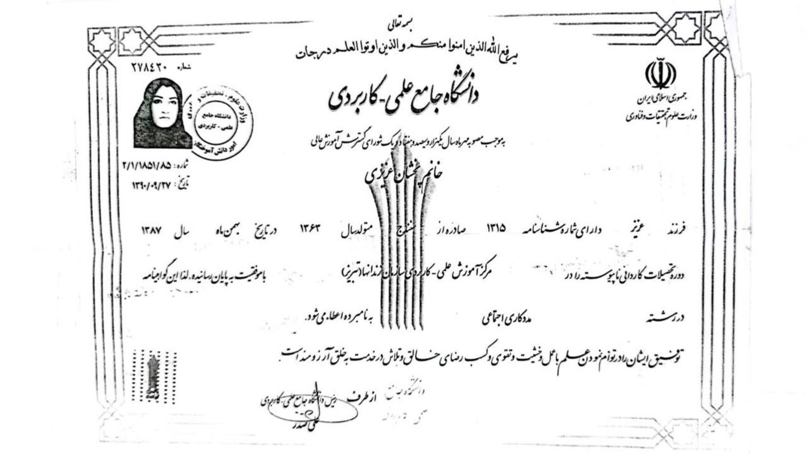 در یکی از این اسناد که در تیر ۱۳۹۱ صادر شده است، آمده که عزیزی با مدرک تحصیلی کاردانی مددکاری اجتماعی و کارشناسی آسیبشناسی اجتماعی، به مدت یک سال در بخش انکولوژی بیمارستان هفتم تیر تهران، به عنوان مشاور و مددکار اجتماعی مشغول به کار بوده است.
