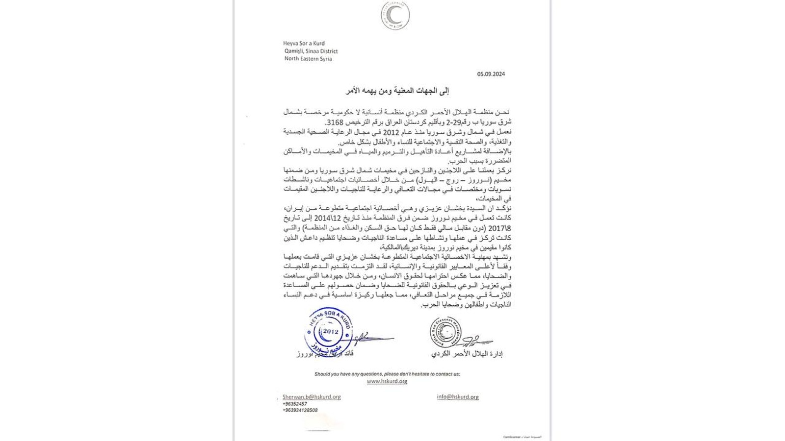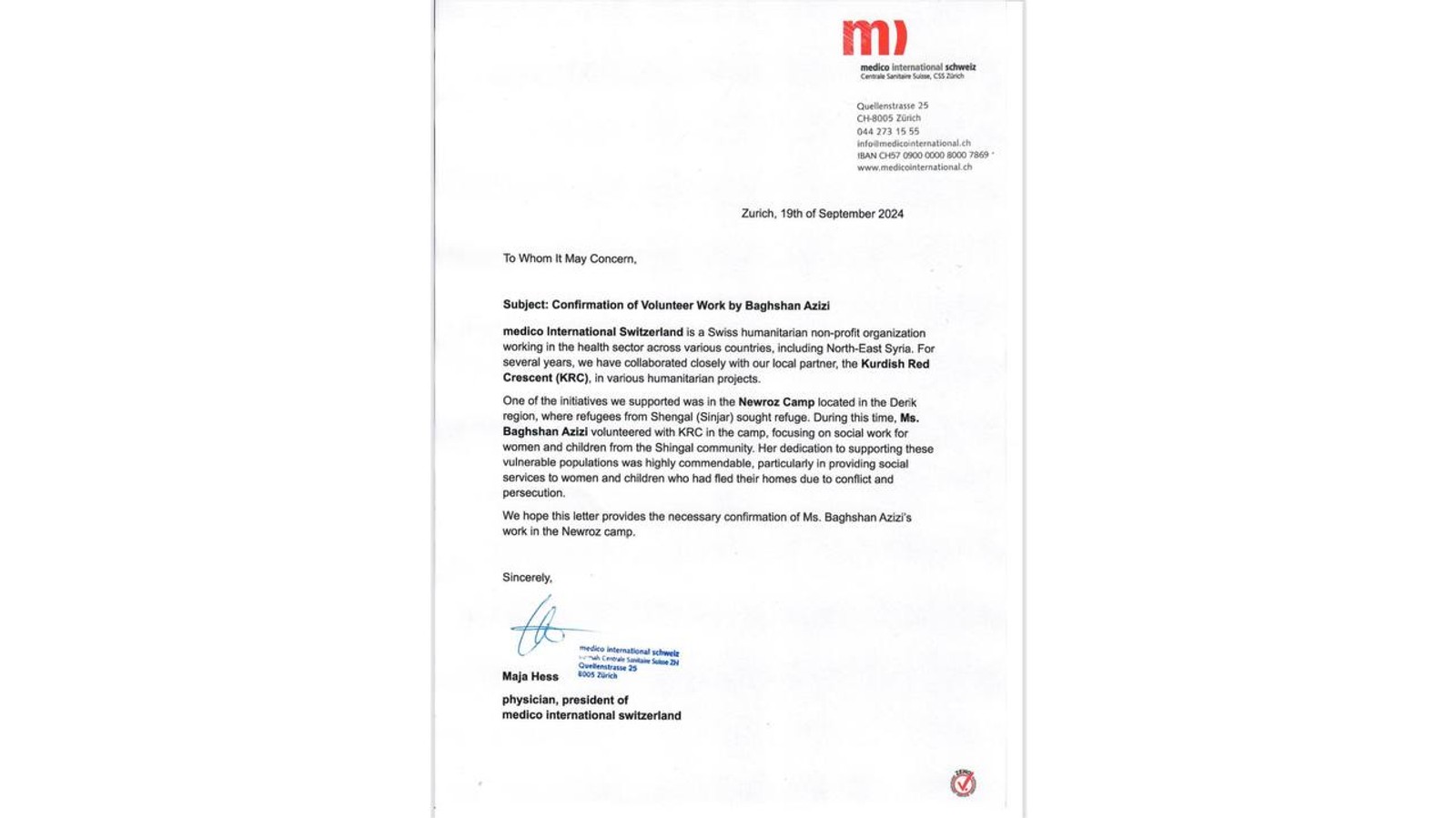در اسناد رسیده به ایران اینترنشنال که امیر رئیسیان، یکی از وکلای او، هم پیشتر منتشر کرده نامههایی از «سازمان هلال احمر کُردی در منطقه شمال شرق سوریه» و «سازمان توانبخشی و توسعه شمس در منطقه شمال شرقی سوریه» دیده میشود.