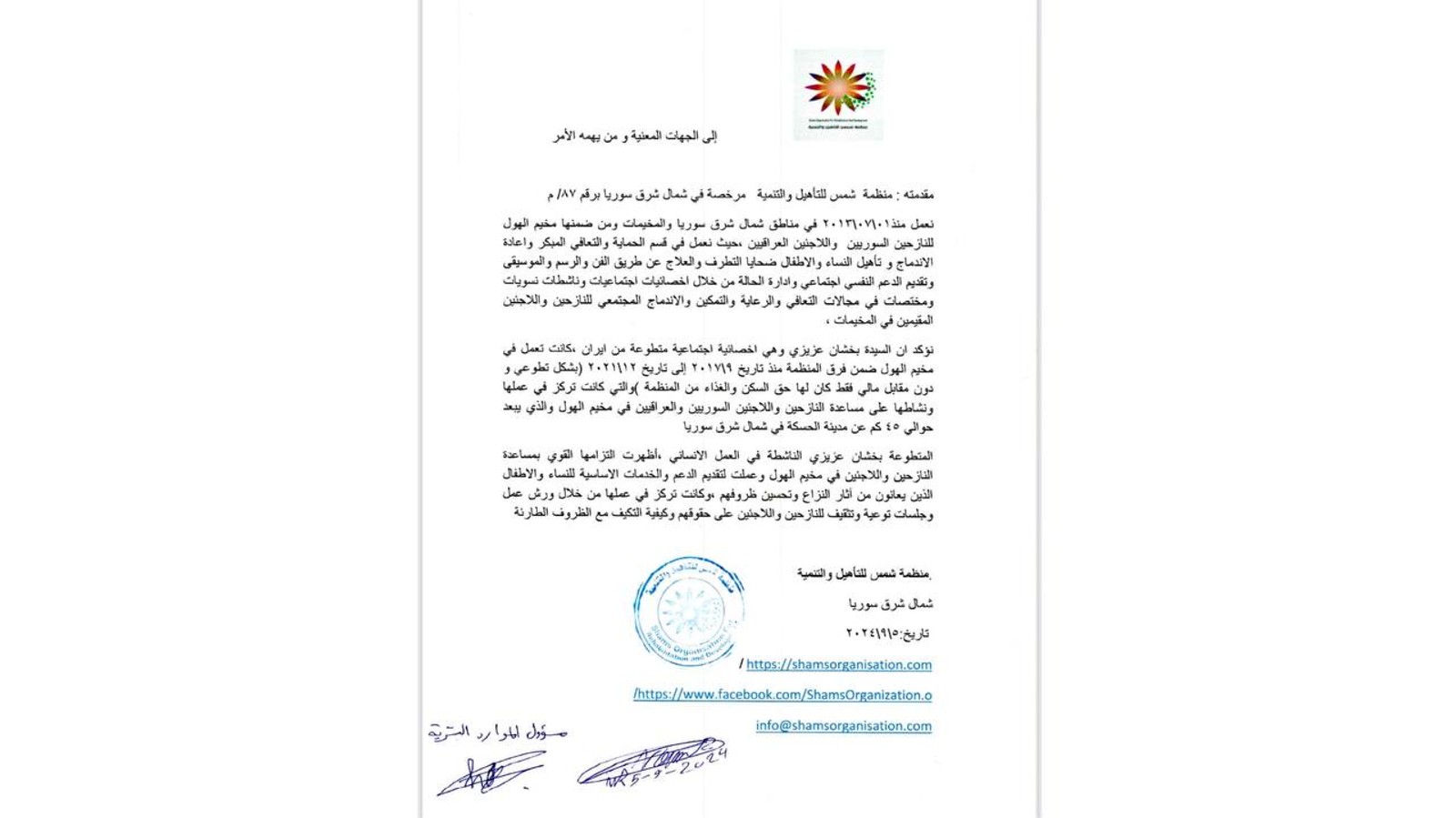 این سازمان در بخشی از نامه خود تاکید کرده که عزیزی در بازه زمانی شهریور ۱۳۹۶ تا دی ۱۴۰۰ بهعنوان مددکار اجتماعی داوطلب در کمپ الهول فعالیت کرده و تنها حق سکونت و تغذیه از این سازمان دریافت کرده است.