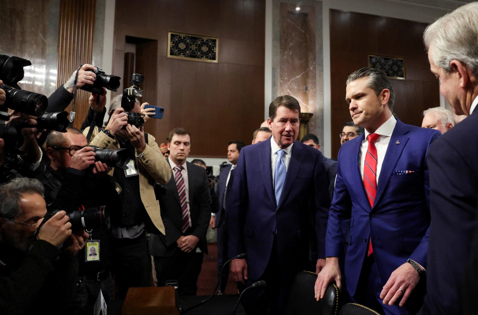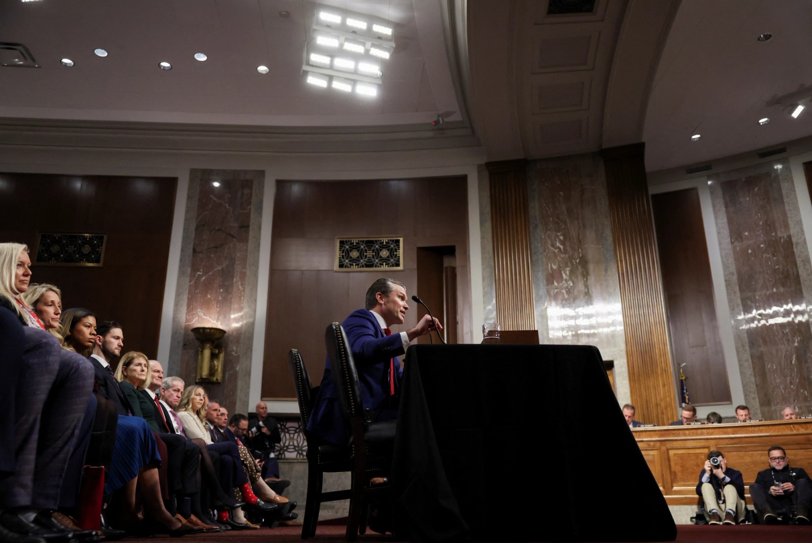 سهشنبه وقتی هگست وارد جلسه استماع شد، با تشویق حامیانش قرار گرفت که شعارهای چون «ایالات متحده آمریکا، ایالات متحده آمریکا، ایالات متحده آمریکا» سر میدادند.