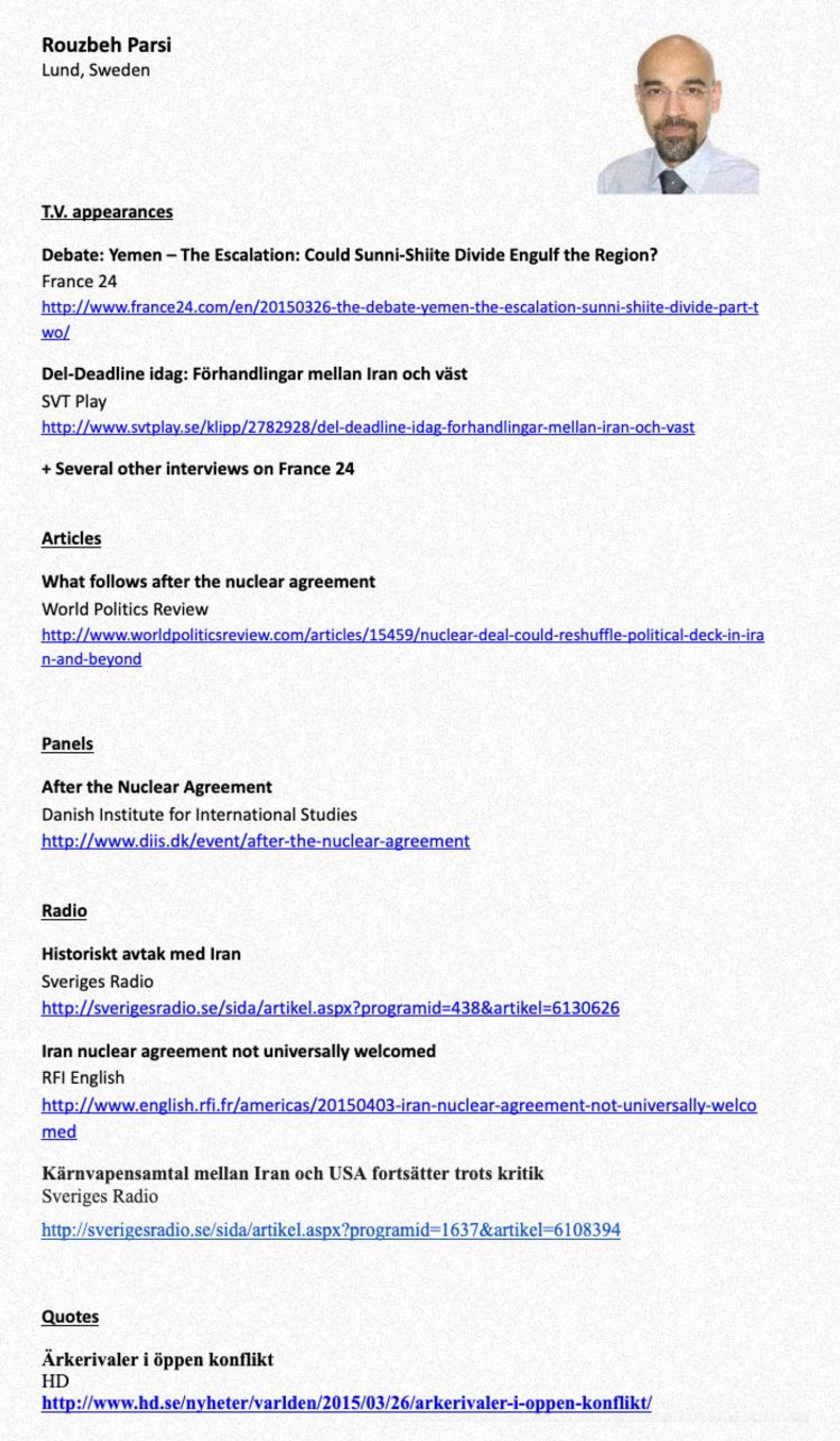 «تلویزیون ۴» یکی از دو شبکه بزرگ و سراسری سوئد، خبر داد که روزبه پارسی، رییس بخش خاورمیانه انستیتوی سیاست خارجی در سوئد و برادر تریتا پارسی، رییس پیشین نایاک، با یک شبکه وزارت خارجه جمهوری اسلامی که هدف آن تاثیر بر سیاستهای کشورهای غربی بوده، مرتبط بوده است.