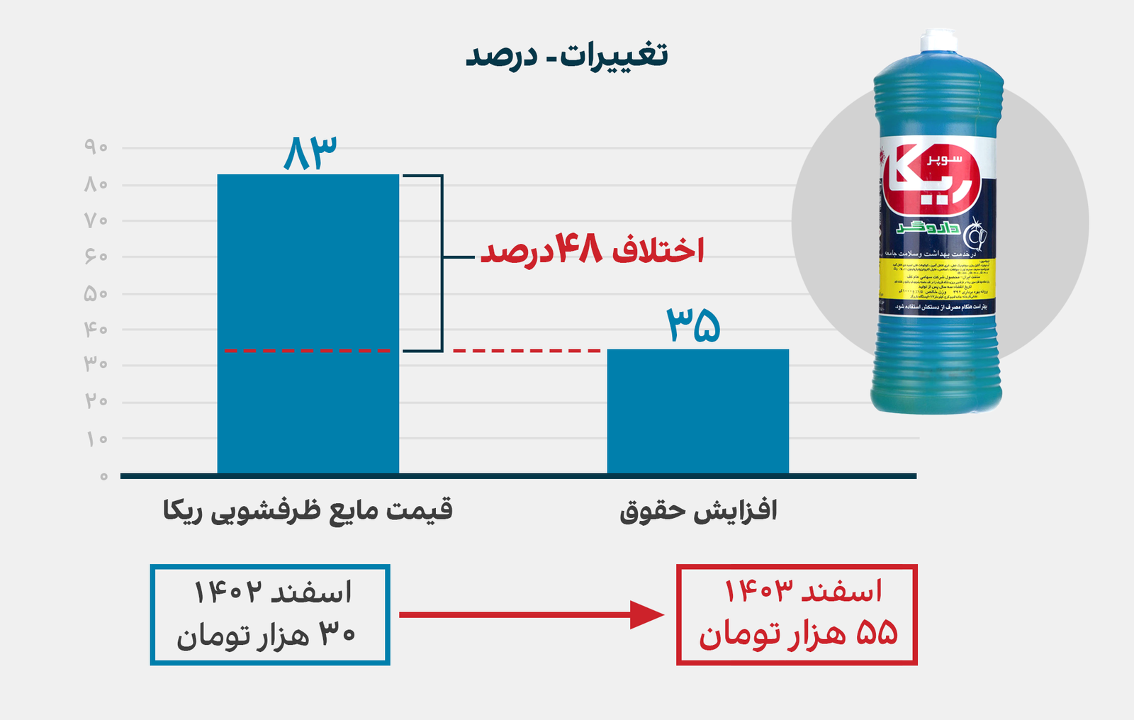 شوینده؛ مایع ظرفشویی ریکای یک لیتری، از معمولترین مواد شوینده مصرفی خانوارهاست. شهروندی از ساری میگوید یک عدد از این محصول را شب عید سال گذشته ۳۰ هزار تومان تهیه میکرده. او میگوید چند روز قبل و در اسفند ۱۴۰۳، همین محصول رابه قیمت ۵۵ هزار تومان تهیه کرده است.