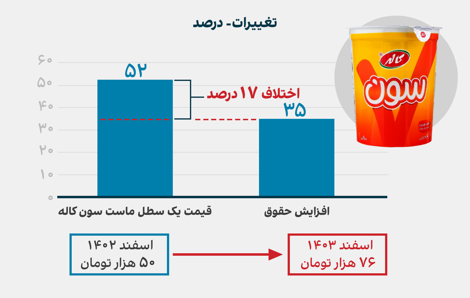 برای نمونه، قیمت ماست سون کاله، اسفند سال گذشته ۵۰ هزار تومان بود و اکنون ۷۶ هزار تومان به فروش میرسد. این یعنی ۵۲ درصد افزایش قیمت که دو برابر اعلام مرکز آمار است.