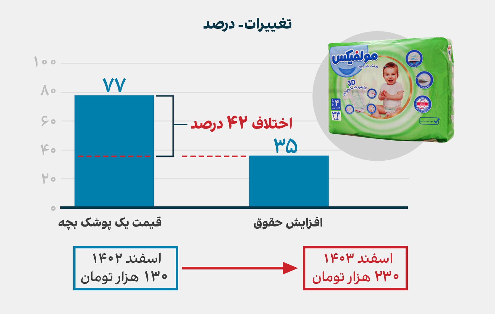 شهروند دیگری از تهران میگوید قیمت پوشک مولفیکس سال گذشته در اسفندماه ۱۲۰ هزار تومان بوده که اکنون آن را ۲۹۰ هزار تومان تهیه میکند.