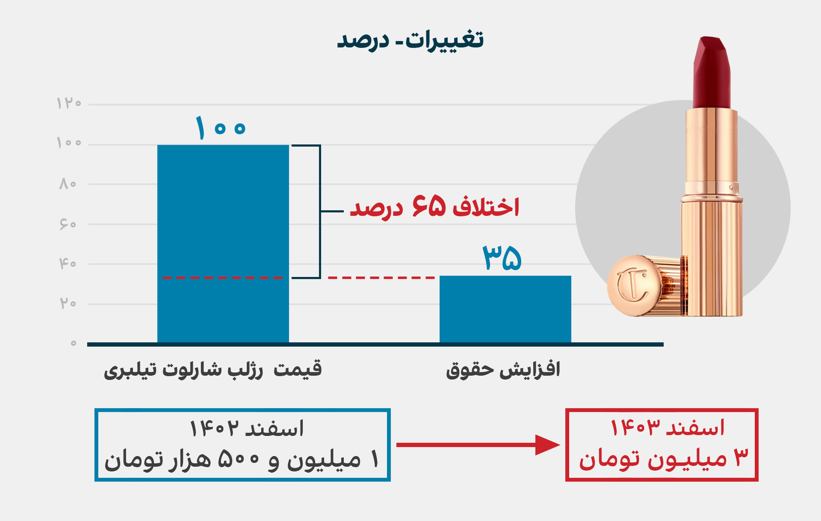 در نمونهای دیگر، رژ لب استایلج از ۸۰۰ هزار تومان به یک میلیون و ۶۰۰ هزار تومان رسیده است.