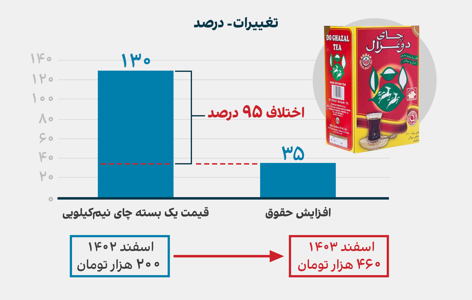 چای، قهوه، قند و شکر؛ یک بسته چای ۵۰۰ گرمی دوغزال که اسفندماه سال گذشته حدود ۲۰۰ هزار تومان بود، اکنون ۴۶۰ هزار تومان است. یک کیلو قهوه گلد نسکافه که سال گذشته ۳۵۰ هزار تومان بود، اکنون یک میلیون و ۶۰۰ هزار تومان است.