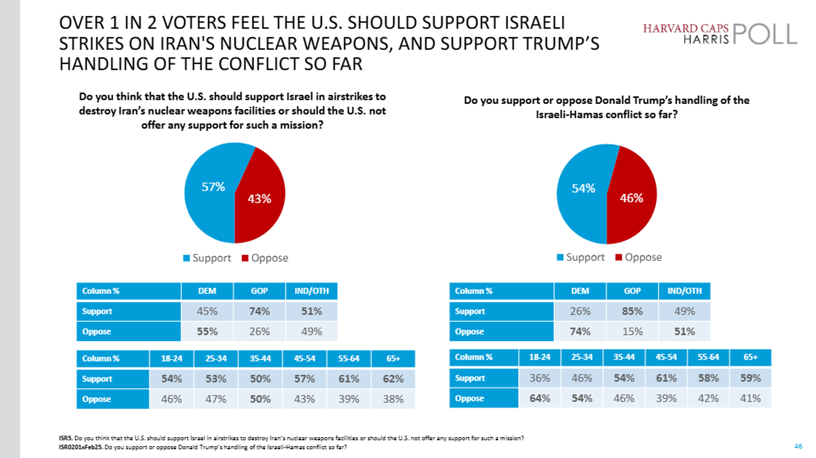 براساس نتایج یک نظرسنجی که از سوی دانشگاه هاروارد و موسسه نظرسنجی هریس انجام گرفته است، اکثریت قاطع کسانی که در این نظرسنجی شرکت کردهاند خواهان اجرای حملات پیشگیرانه علیه تاسیسات هستهای ایران، اخراج دائمی حماس از غزه و حمایت از عملیات نظامی اسرائیل علیه این گروه هستند.