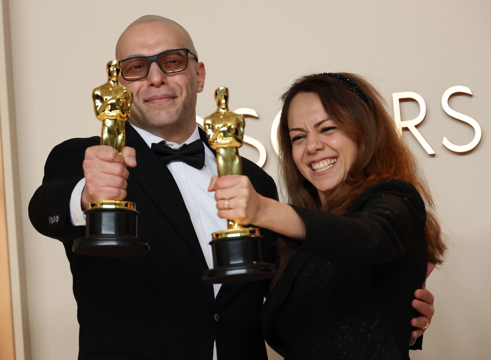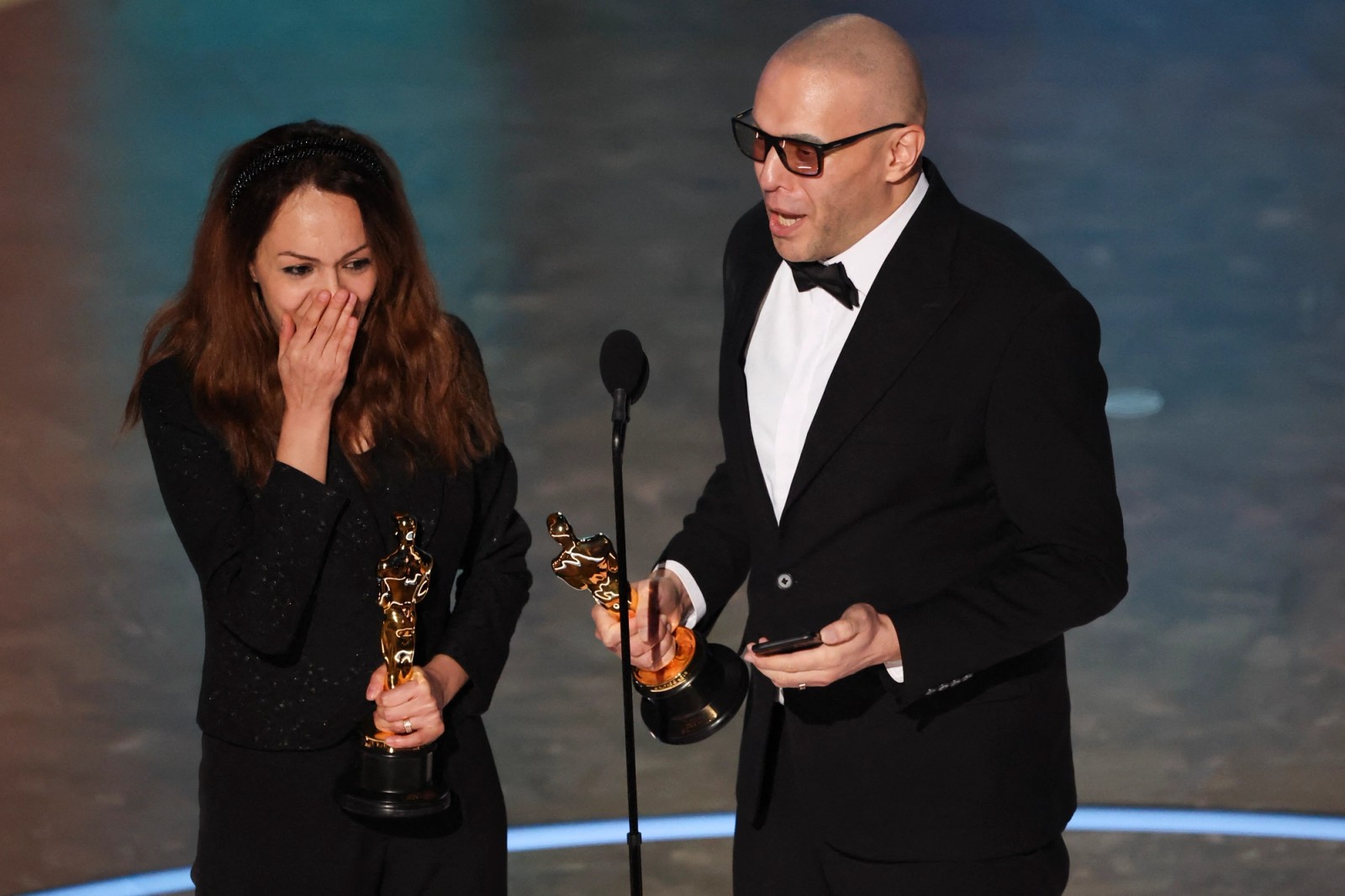 واکنش شیرین سوهانی و حسین ملایمی به برنده شدن جایزه اسکار بهترین فیلم کوتاه انیمیشن برای «در سایه سرو» در مراسم نود و هفتمین دوره جوایز اسکار در هالیوود، دوم مارس ۲۰۲۵