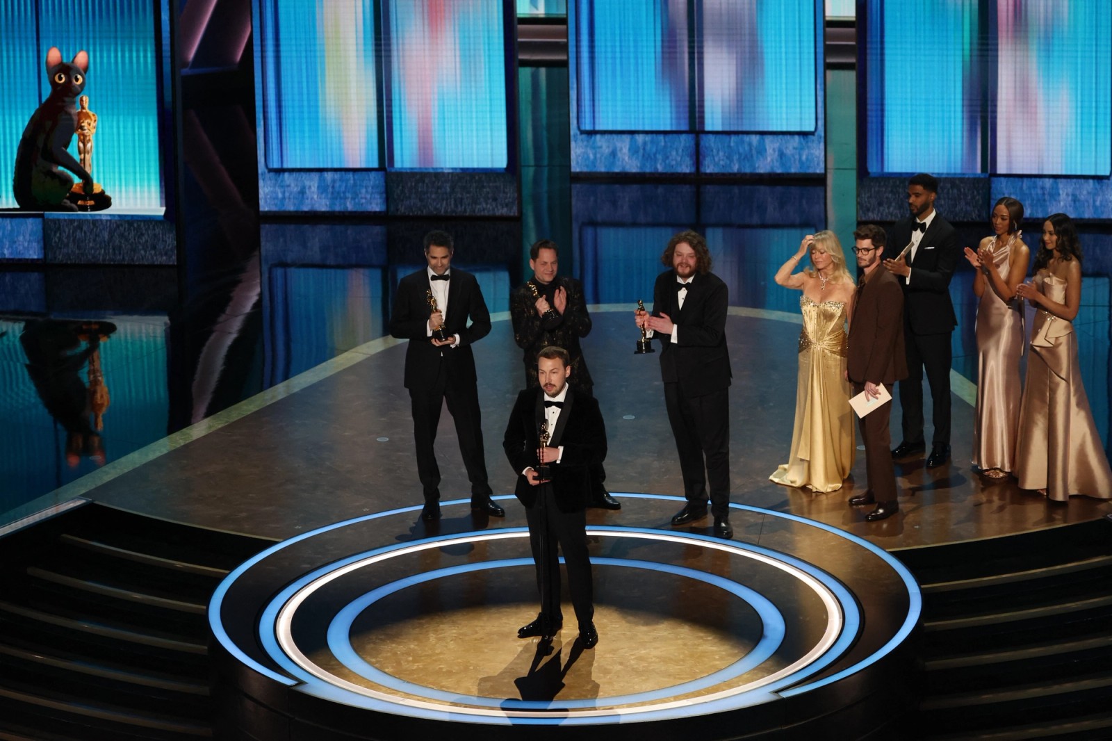 سازندگان انیمیشن «جریان» در حال دریافت جایزه اسکار