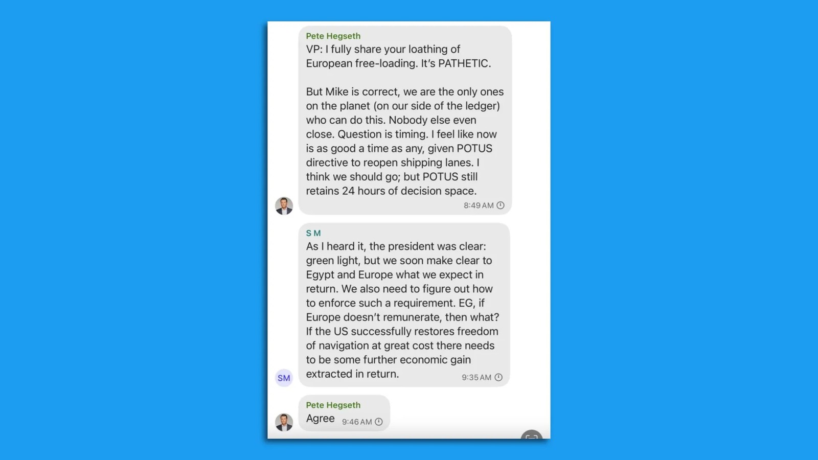 نگاه تحقیرآمیز به اروپا: جیدی ونس استدلال کرد که این حملات بیشتر به نفع اروپا خواهد بود و اروپا باید خود برای این عملیات اقدام کند. حتی زمانی که والتز و دیگران توضیح دادند که تنها آمریکا توانایی اجرای چنین حملاتی را دارد، ونس پاسخ داد: «من از اینکه دوباره اروپا را نجات دهیم متنفرم.» پیت هگست نیز پاسخ داد: «من کاملا با بیزاری شما از وابستگی اروپا موافقم. این وحشتناک است.» در همین حال، فردی با نام حروف اختصاری اس ام (که احتمالا میتواند استفان میلر باشد) در این چت نوشت که آمریکا باید اطمینان حاصل کند که اروپا و مصر در ازای این حملات، چیزی بدهند. او نوشت: «اگر آمریکا با هزینه زیاد، آزادی ناوبری را بازگرداند، باید یک مزیت اقتصادی در قبال آن دریافت کند.»