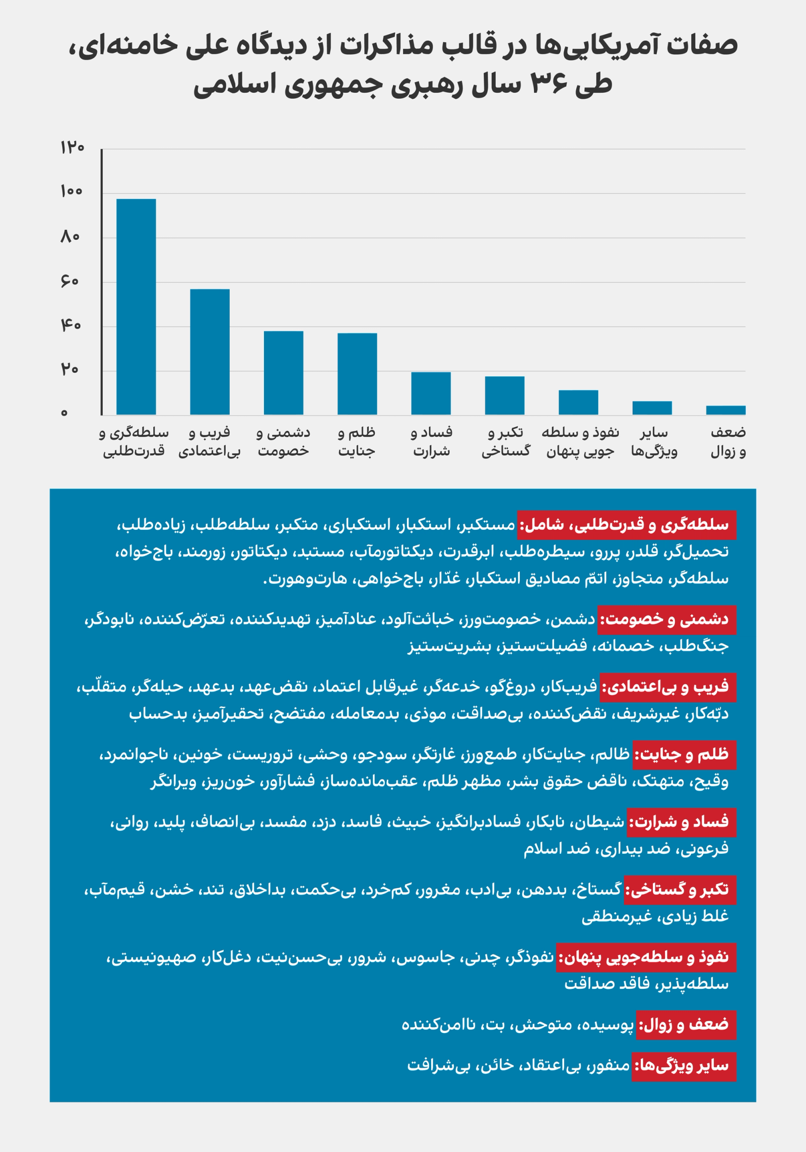 این صفتها نشاندهنده نگاه تقابلی به آمریکاست که با تنشهای منطقهای و ادامه فشارهای اقتصادی همخوانی دارد.