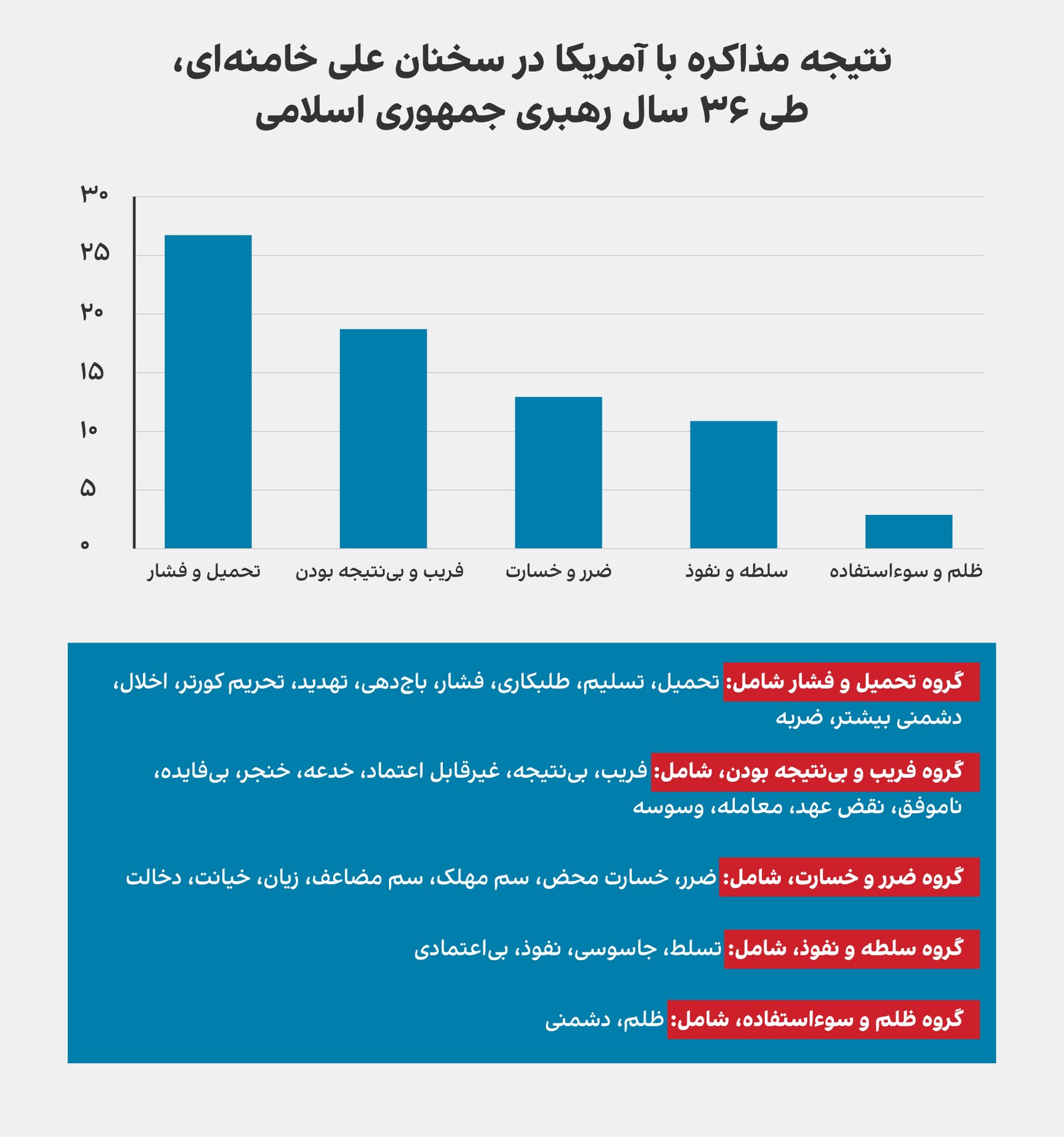 ۲۶ درصد از نتایج به گروه «ضرر» با کلیدواژههای «ضرر، خسارت محض، سم مهلک، سم مضاعف، زیان، خیانت و دخالت» اشاره دارد که بیانگر باور رهبر جمهوری اسلامی به ضرر در مذاکره با آمریکاست.