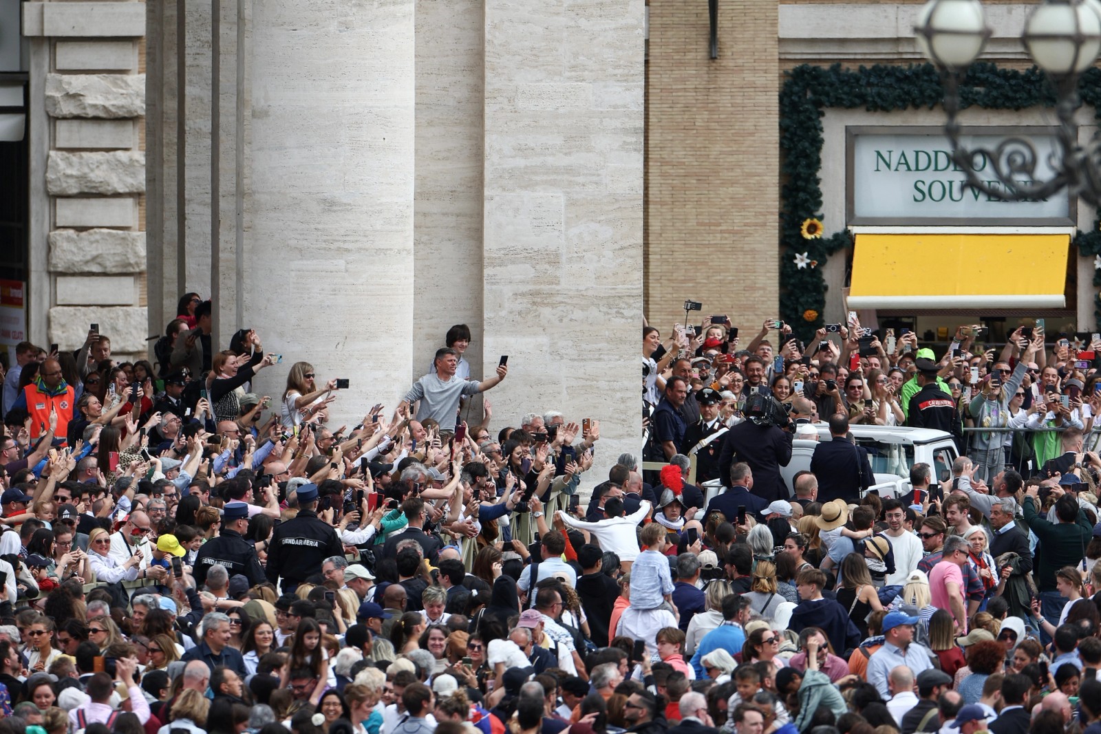 این پاپ ۸۸ ساله بر روی یک صندلی بلند در قسمت پشتی خودرو سفیدرنگ خود نشسته بود، در حالی که مردم در امتداد راهروهای میدان صف کشیده بودند و فریاد میزدند: زنده باد پاپ!