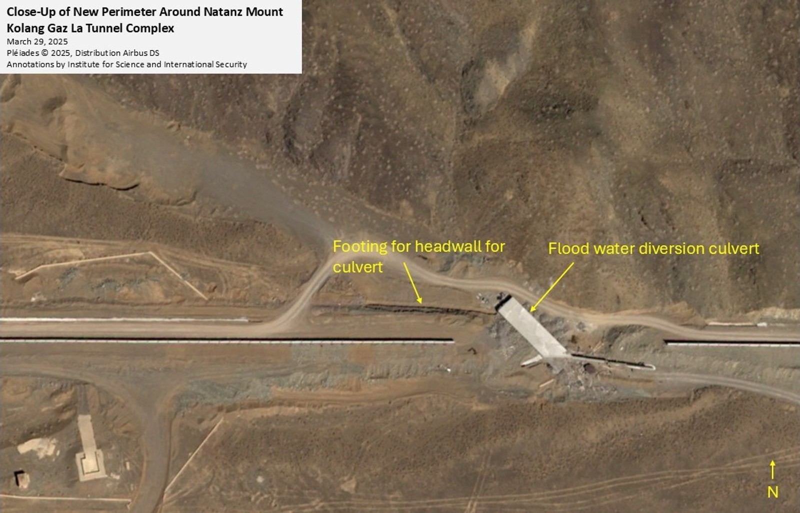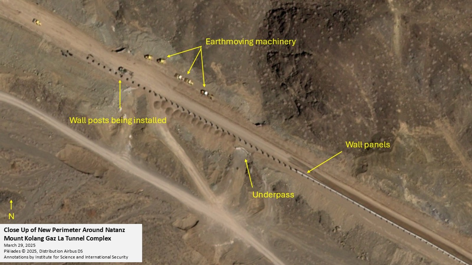 موسسه علوم و امنیت بینالملل در پایان گزارش خود نوشته است: «تصاویر ماهوارهای که در پایان مارس گرفته شده، نشان میدهند که عملیات گستردهای برای تسطیح زمین و آمادهسازی مسیر نصب حصار امنیتی در جریان است. در حالیکه سمت غرب تا تاریخ ۲۹ مارس ۲۰۲۵ همچنان باز بود، نصب پنلهای دیواری از دو سمت شمال و شرق آغاز شده است. ضلع شمالی این حصار به حصار امنیتی پیشین نطنز متصل میشود و در شرق به جاده مجاور میرسد. بنابراین، این حصار نه تنها تونلهای جدید و زیرساختهای مرتبط را در بر میگیرد، بلکه همچنین شامل ورودی و سالن زیرزمینی پیش از سال ۲۰۰۷ نیز میشود.»