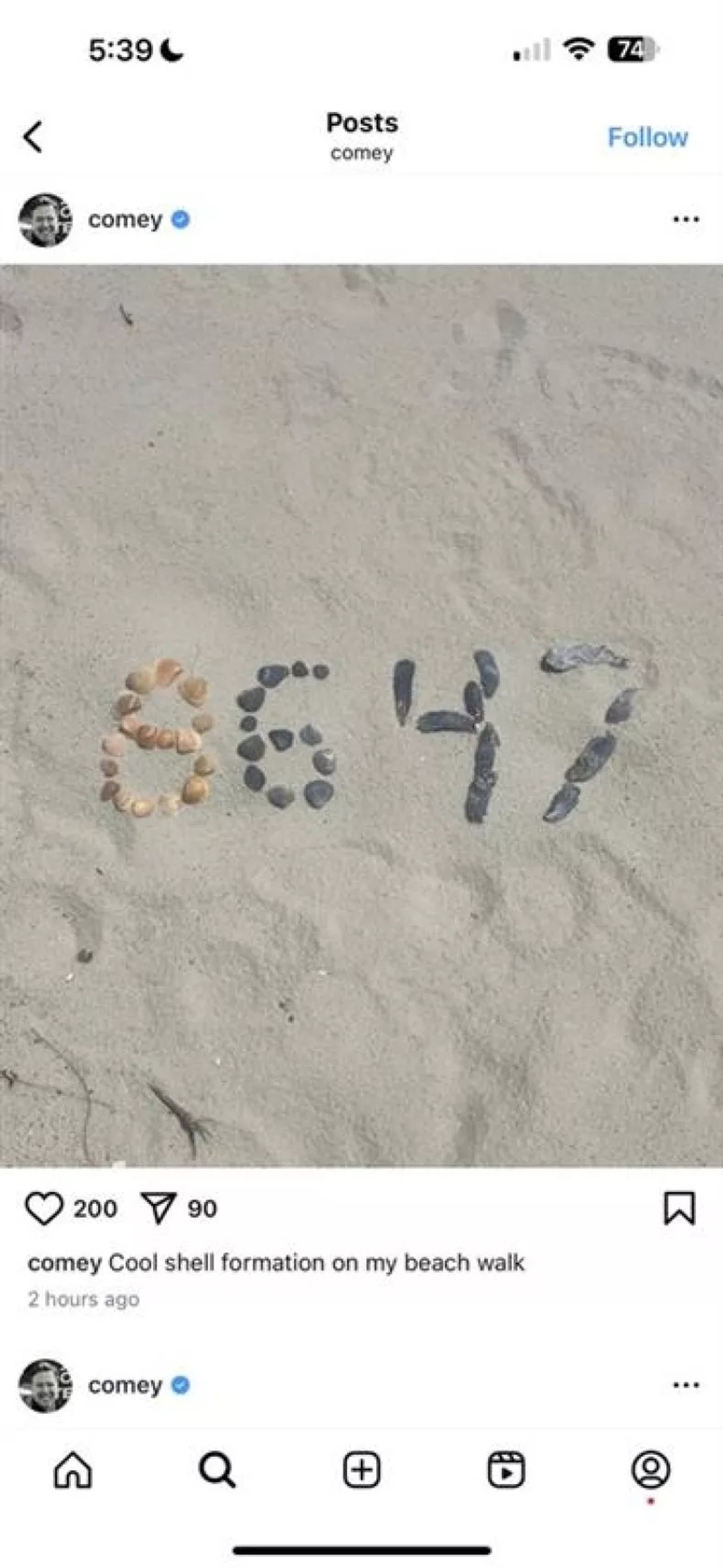کومی، که در سال ۲۰۱۷ از سوی ترامپ از سمتش برکنار شد، تصویری از عدد «۸۶۴۷» را که با صدفهای دریایی روی ساحل شکل داده شده بود در اینستاگرام منتشر کرده و نوشته بود: «چیدمان جالب صدفها در پیادهرو ساحلیام.»