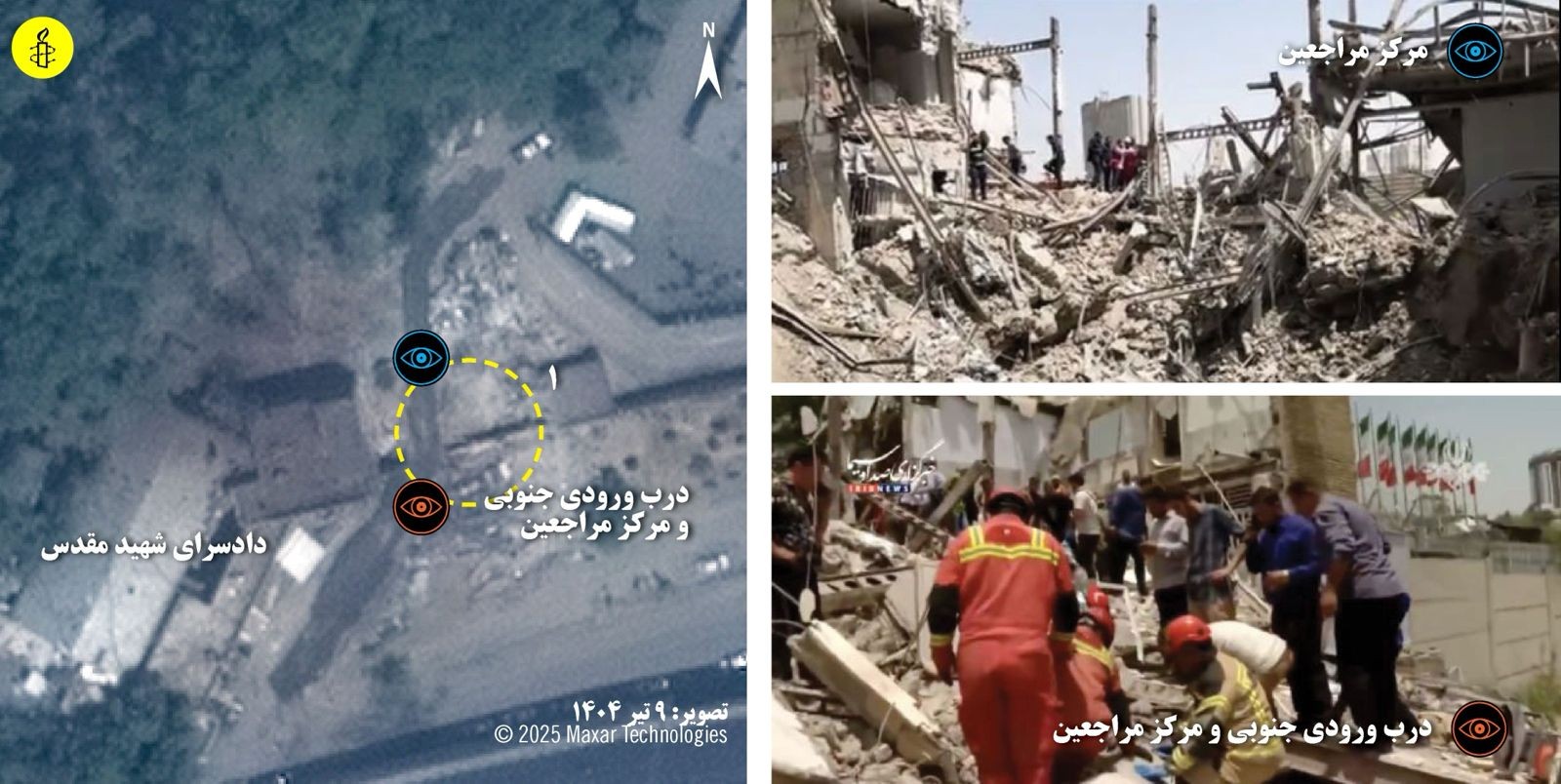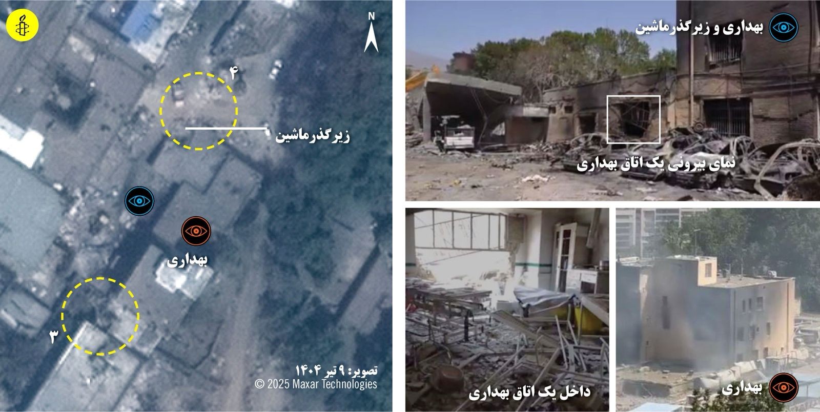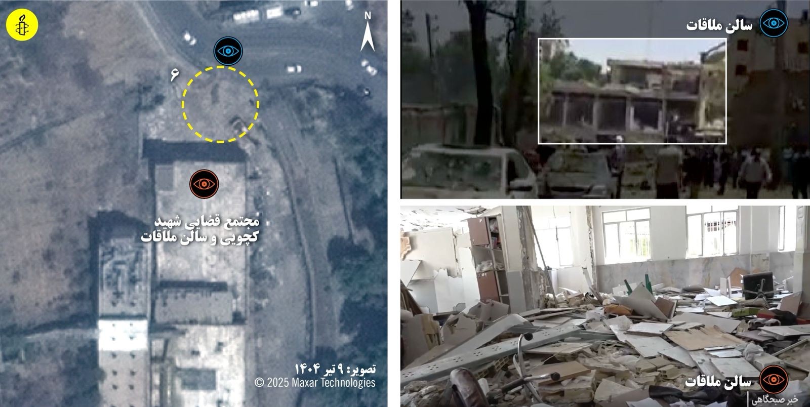 در بیانیه سازمان عفو بین‌الملل تاکید شده است: «آزمایشگاه شواهد سازمان عفو بین‌الملل تصاویر ماهواره‌ای پیش و پس از حملات را تحلیل کرده و ۲۲ ویدیو و ۵۹ عکس را راستی‌آزمایی کرده است. این شواهد، تخریب و آسیب گسترده در شش نقطه از بخش‌های جنوبی، مرکزی و شمالی مجموعه زندان اوین را نشان می‌دهند.»