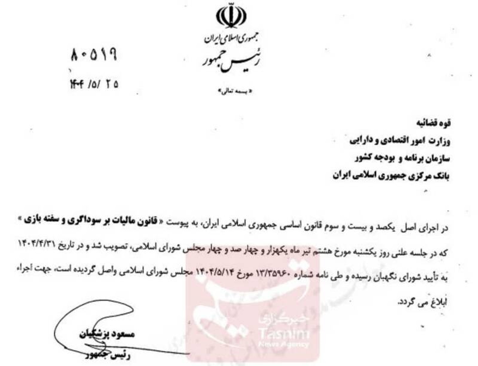 قانون «مالیات بر سوداگری و سفته‌بازی» که هشتم تیر به تصویب مجلس شورای اسلامی رسید، جمعه ۲۵ مرداد توسط پزشکیان ابلاغ شد.