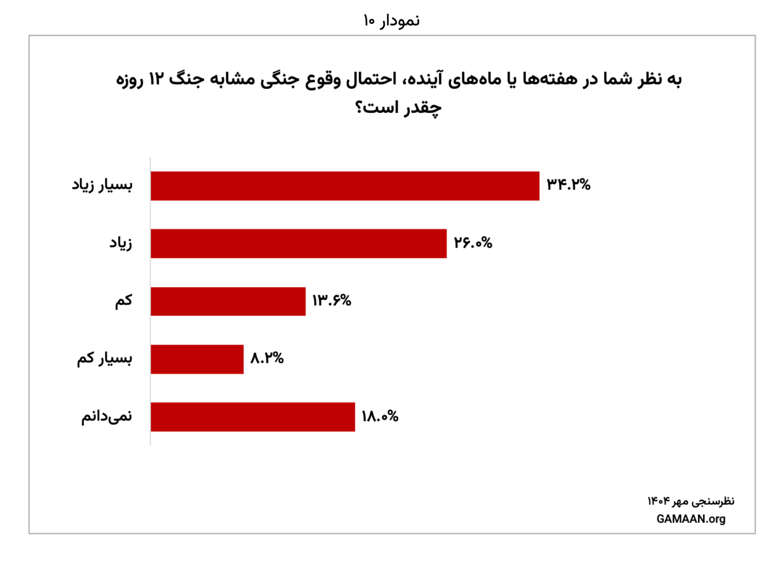 در پاسخ به پرسشی درباره احتمال وقوع رویارویی مشابه جنگ ۱۲ روزه، ۳۴ درصد از شرکت‌کنندگان احتمال آغاز چنین نبردی را «بسیار زیاد» و ۲۶ درصد آن را «تا حدی زیاد» ارزیابی کردند.