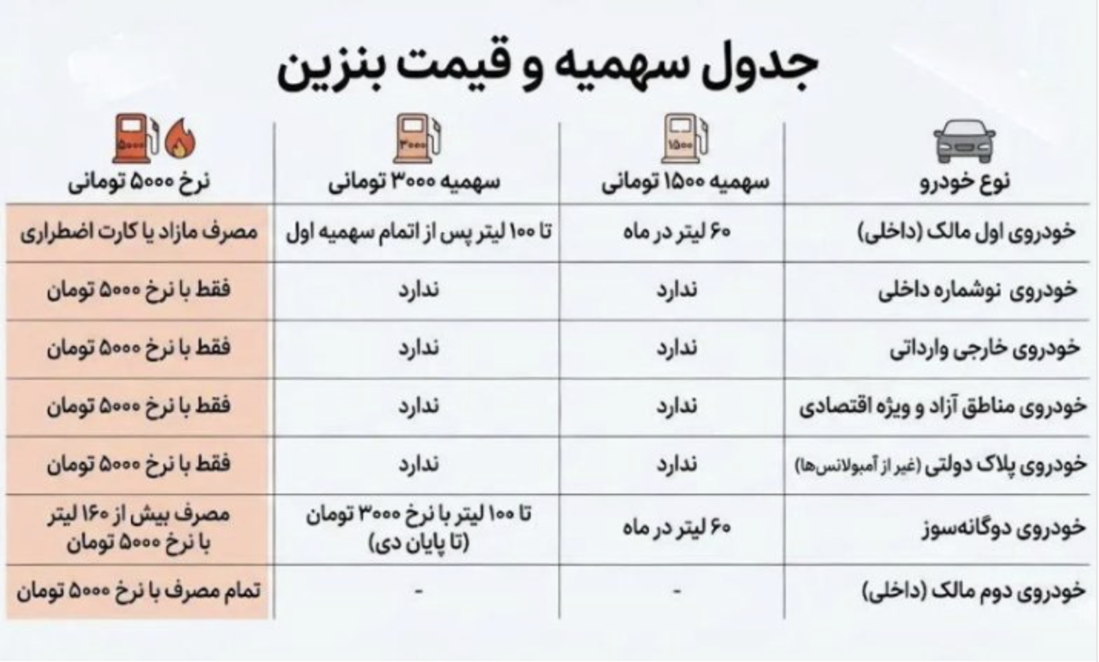 بر اساس این طرح، بنزین سهمیهای ۶۰ لیتری با نرخ ۱۵۰۰ تومان، نرخ دوم ۱۰۰ لیتری با نرخ سه هزار تومان و مصرف مازاد یا با کارت جایگاه با نرخ پنج هزار تومان عرضه میشود.