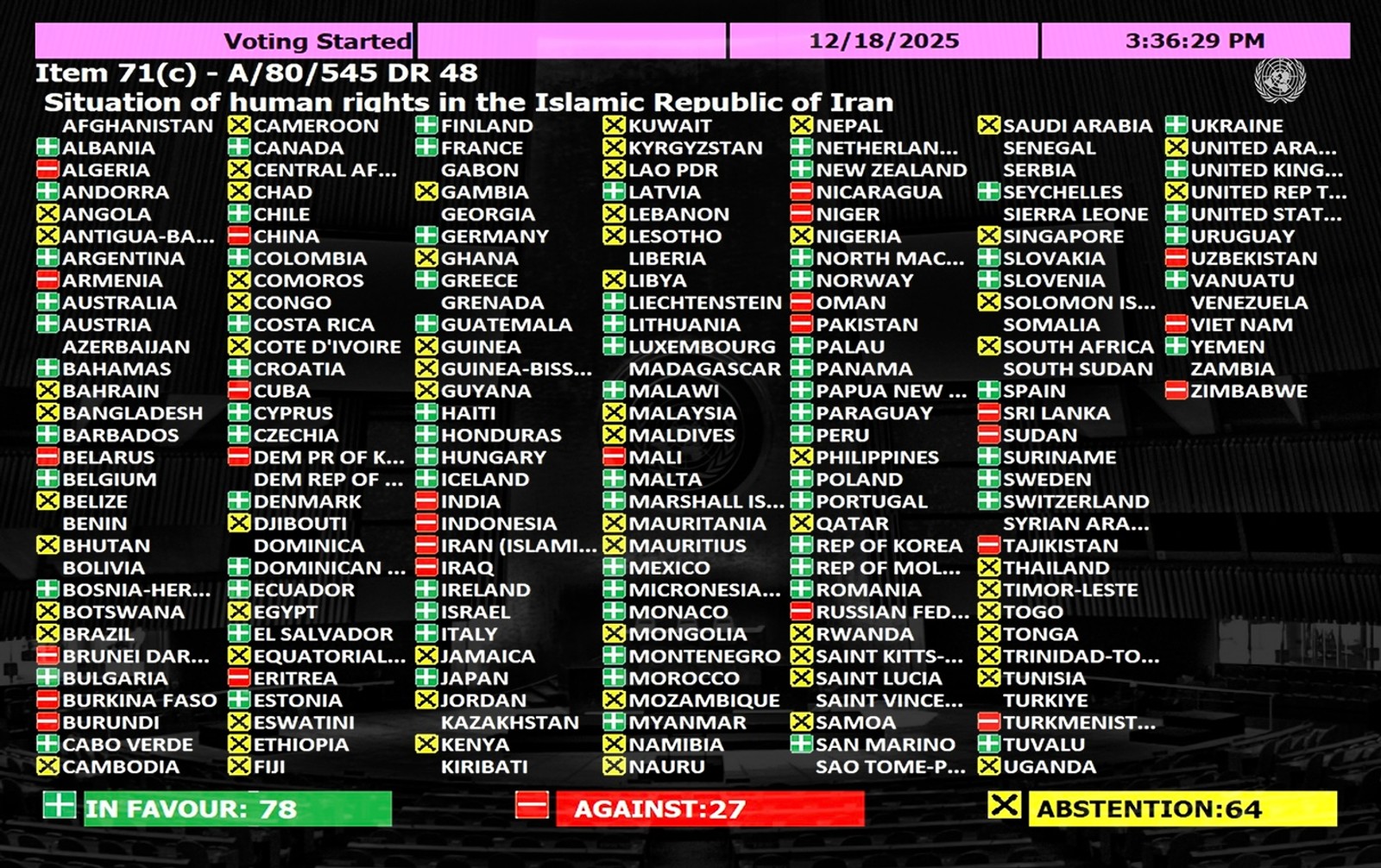 سال گذشته قطعنامه پیشنهادی با ۸۰ رای موافق، ۲۷ رای مخالف و ۶۸ رای ممتنع به تصویب رسیده بود. مقایسه این رایگیری با رای کمیته سوم مجمع عمومی در ماه گذشته نیز نشان میدهد بخش عمده تفاوتها به غیبت یا حضور متفاوت برخی کشورها بازمیگردد.