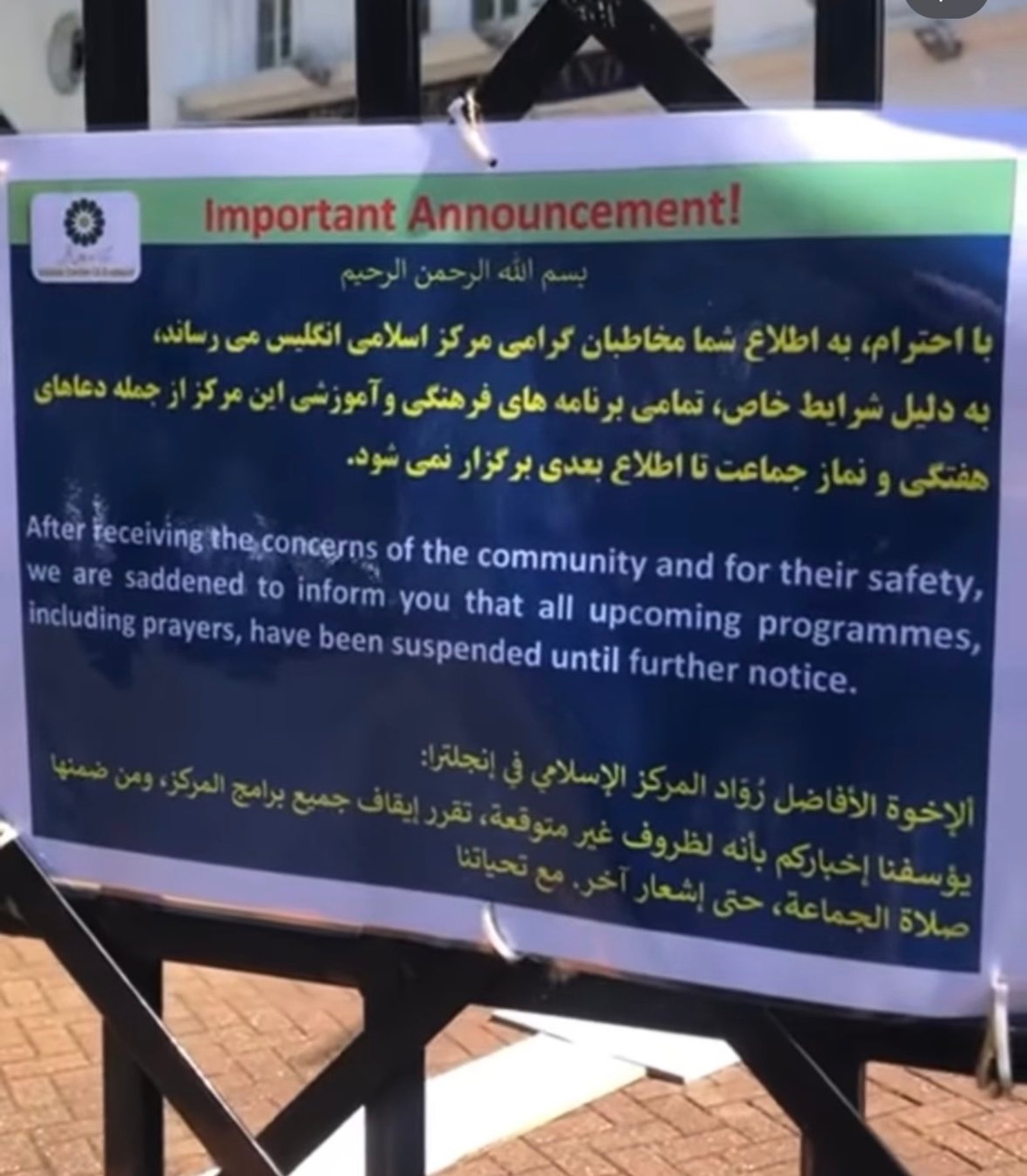 A banner has been installed on the closed door of the center that reads, “After receiving the concerns of the community and for their safety, we are saddened to inform you that all upcoming programs, including prayers, have been suspended until further notice.” The message was later removed.