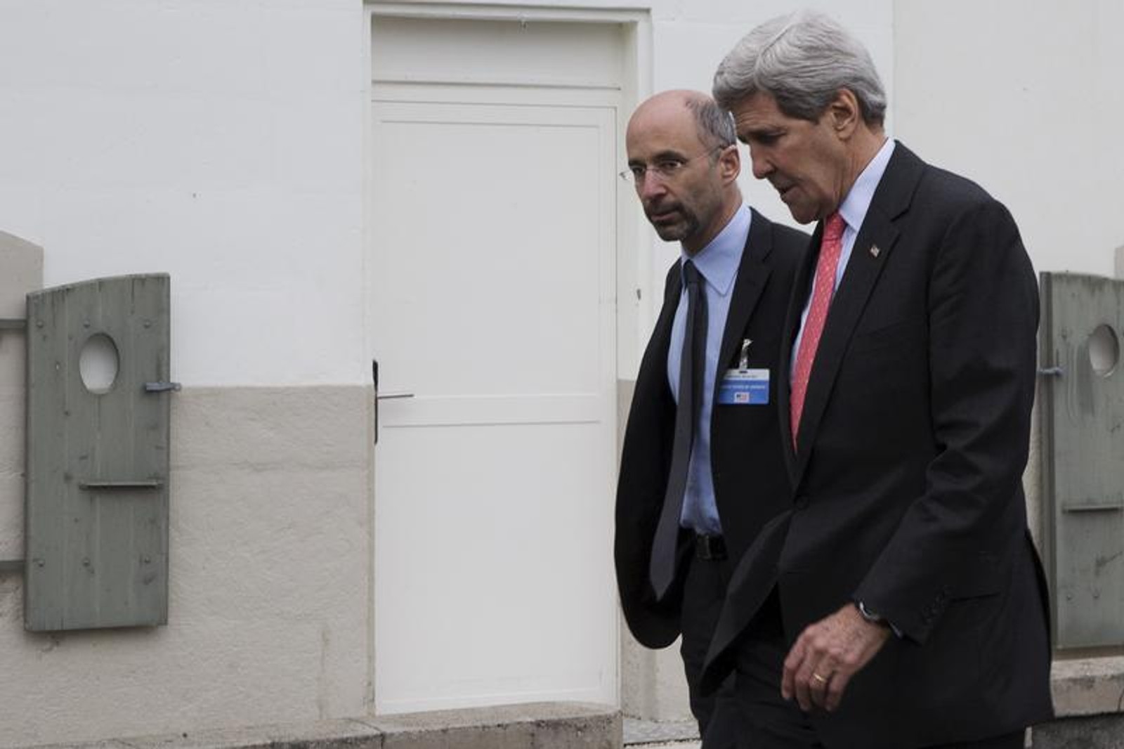 Then-US Secretary of State John Kerry walks to lunch with members his negotiating team, including Robert Malley (L) from the U.S. National Security Council, following a meeting with Iran's Foreign Minister Javad Zarif over Iran's nuclear program in Lausanne March 20, 2015.