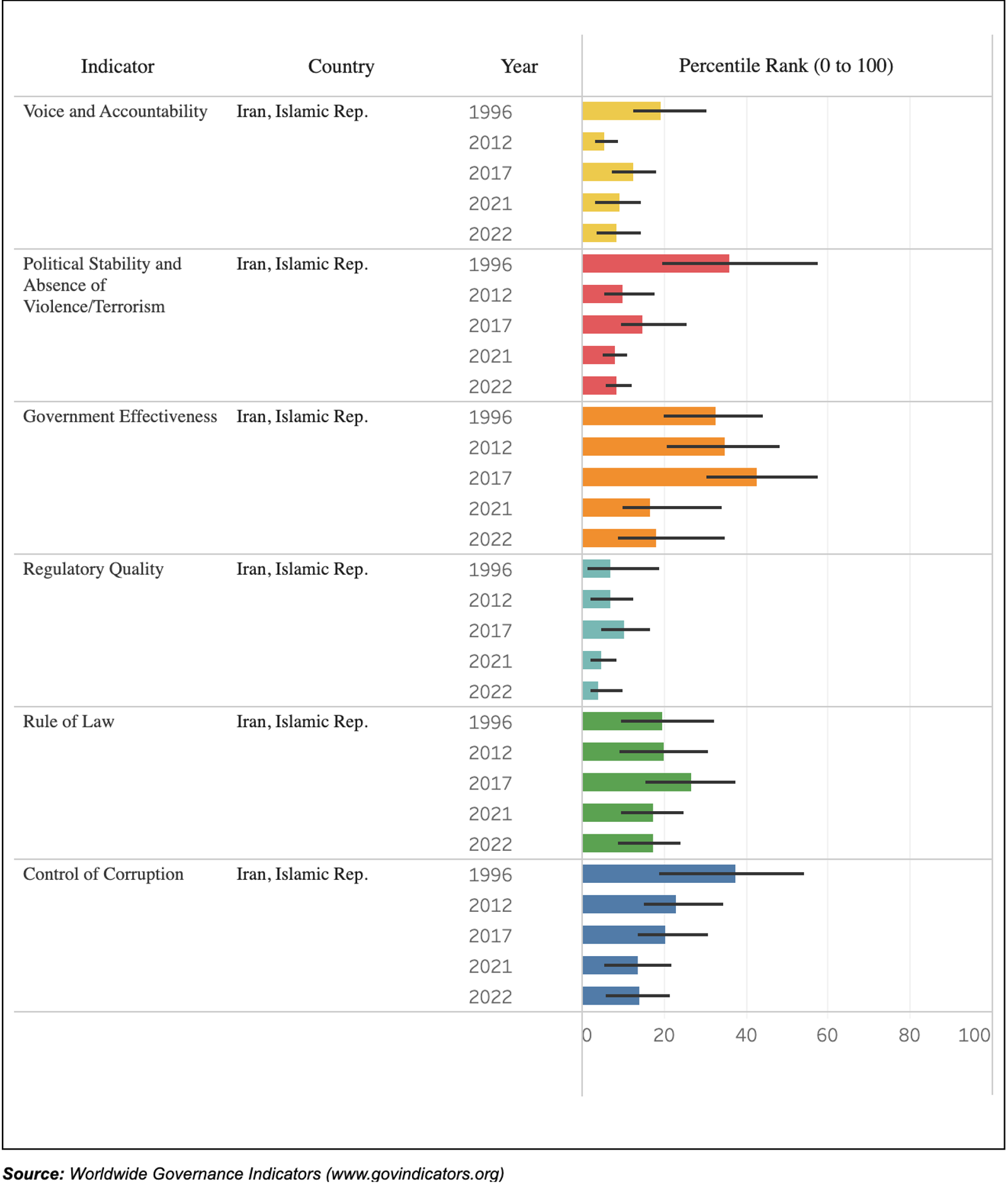 The Political Stability and Absence of Violence/Terrorism index assesses the likelihood of political instability and/or politically motivated violence, including terrorism. In this category, Iran scored -1.59 in 2022. In addition to its being home to the Islamic Revolutionary Guards Corp, Iran has militia proxies across the region from Syria and Lebanon to Yemen and Iraq.