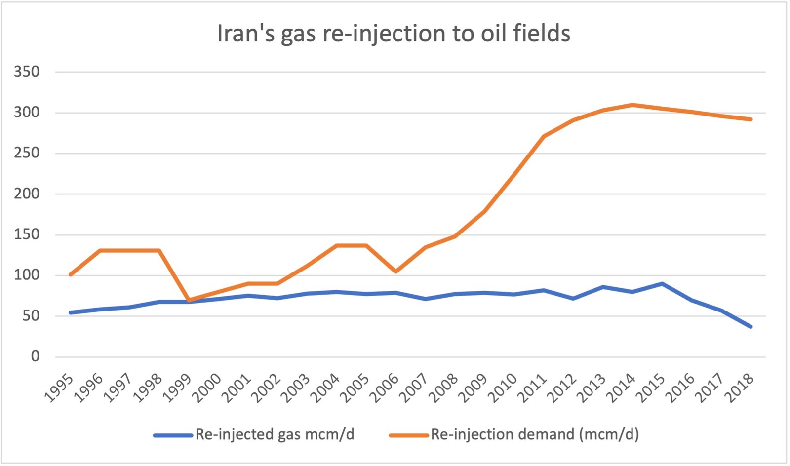 According to estimates from the Parliament's Research Center and the Ministry of Oil, Iran has injected an average of 70 mcm/d into its oil fields during the last three decades. However, this re-injection rate has sharply declined since 2015.