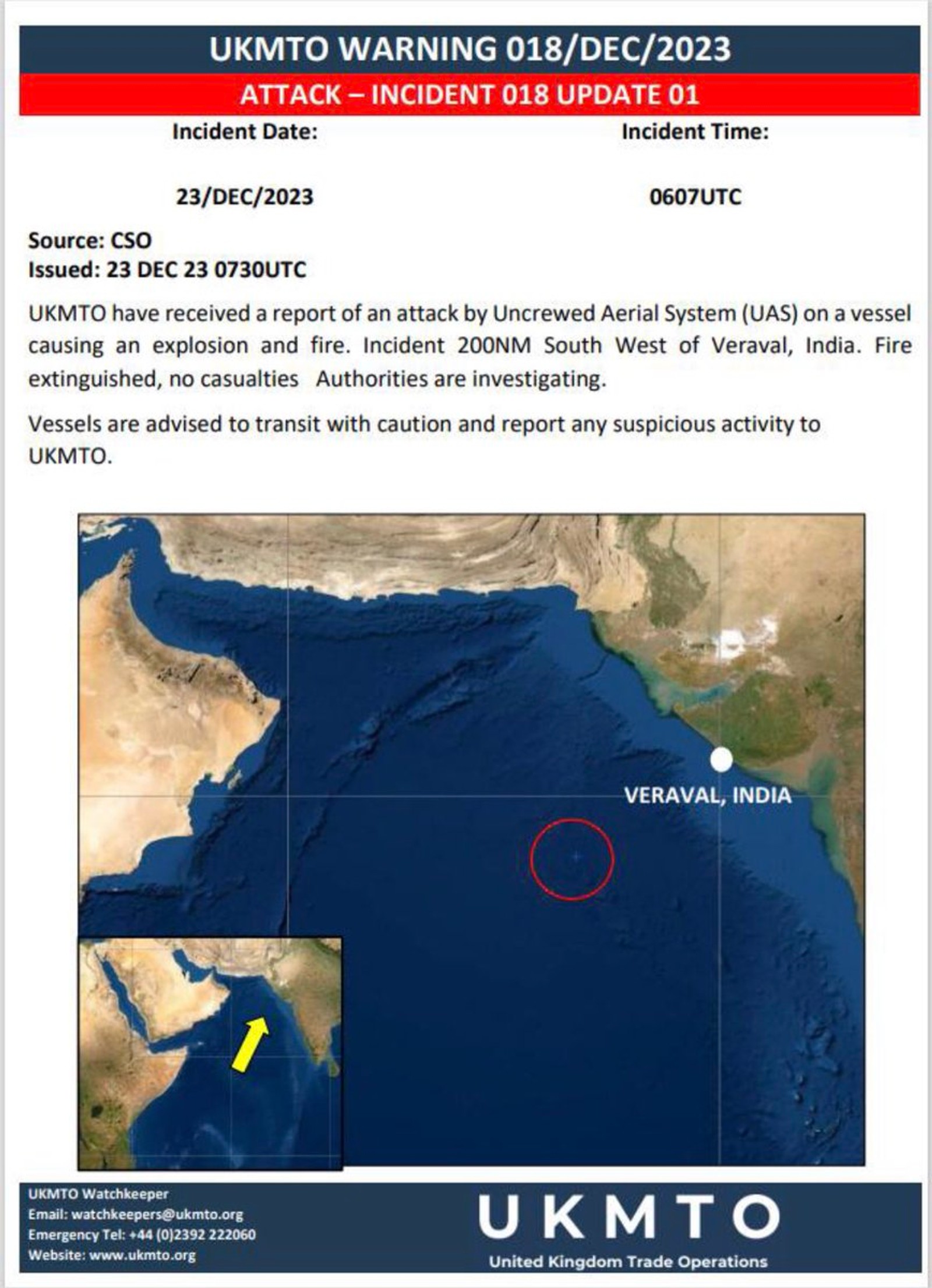 United Kingdom Maritime Trade Operation reported the incident on Saturday, as attacks by Iran-backed Houthi forces have escalated against commercial shipping in the Red Sea. The location is hundreds of miles from the Iranian and Yemeni territories, and it is not known from where the drone was launched.