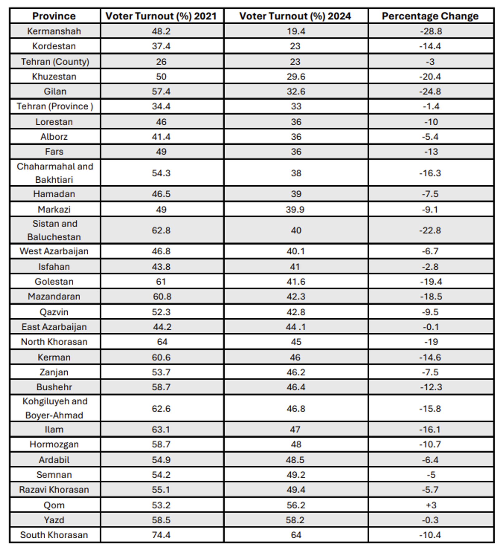 The northern provinces of Gilan, Mazandaran and Golestan also saw significant decreases of 24.8, 18.5 and 19.4 percent, respectively, while Khuzestan's turnout dropped by 20.4 percent.