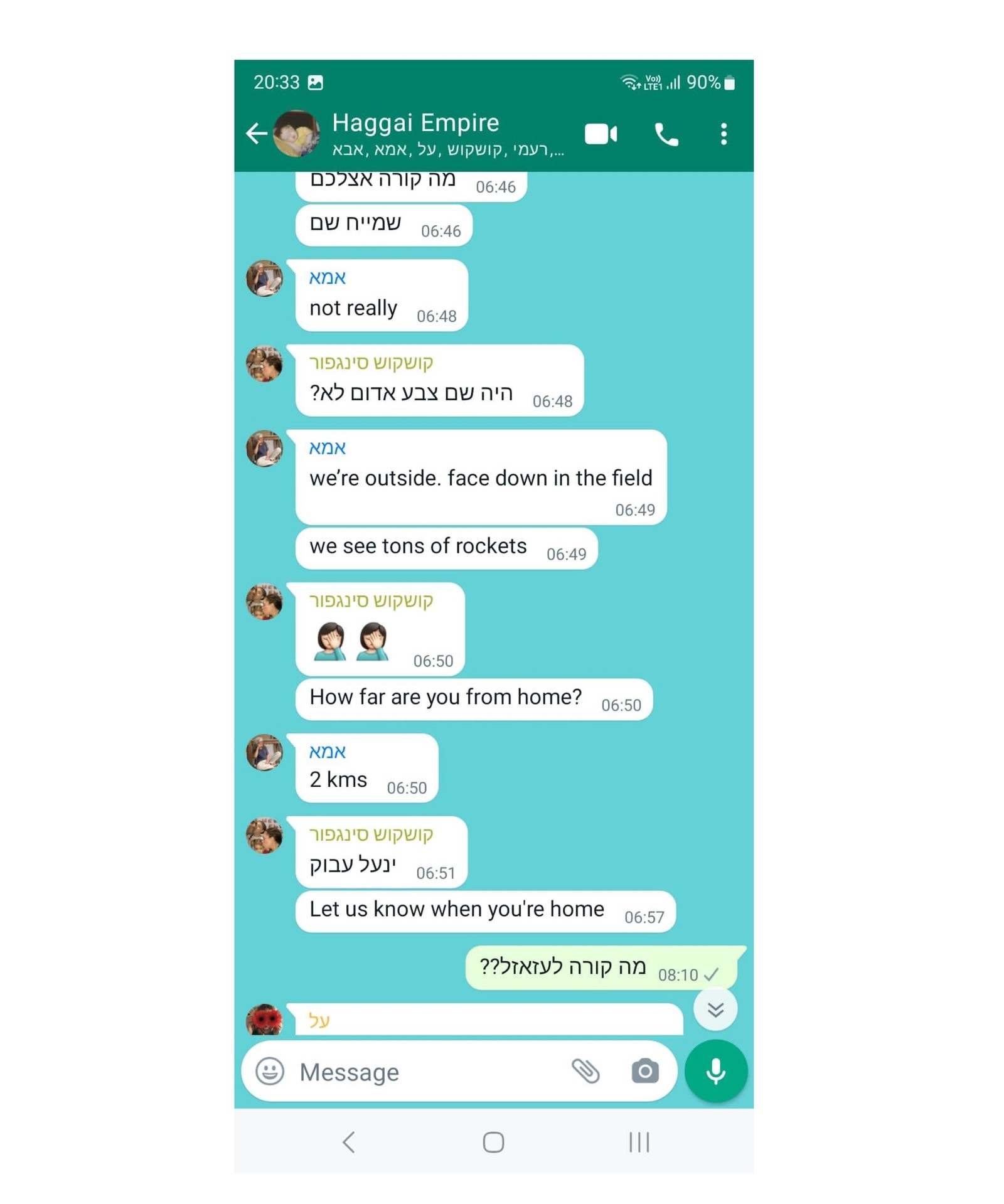 Judi and Gadi sent a final text message to their children at around seven in the morning, saying that they were under attack from rockets. It ended with Iris asking her parents to let her know when they arrived home.