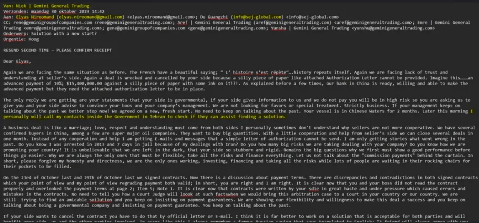 In one email dated 30 October 2023, Gemini representative Niek Tersteeg confronted his Iranian counterpart Elyas Niroumand about a delayed payment. While citing confusion over contract terms, Tersteeg made clear that the problem was not procedural.